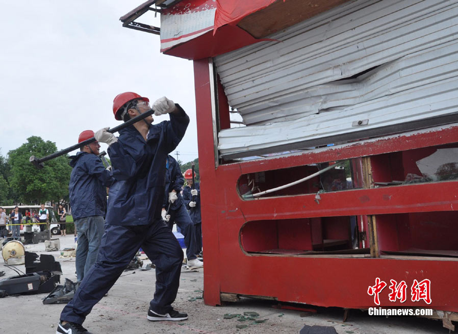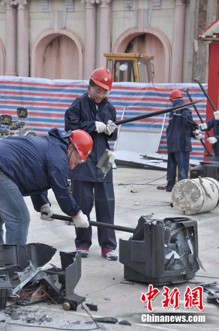 9月4日,一群全副武裝、手持鐵錘的都市人在長(zhǎng)沙世界之窗內(nèi)廣場(chǎng)上瘋狂錘砸廢舊小鐵屋,以此宣泄心中的壓力。據(jù)悉,為幫助都市人群釋放因工作、生活帶來(lái)的壓力和郁悶,長(zhǎng)沙世界之窗從當(dāng)日開(kāi)始舉行為期一個(gè)月的減壓節(jié)。主辦方將收集來(lái)的摩托車(chē)、小車(chē)、電視機(jī)、洗衣機(jī)等廢舊設(shè)備擺放在預(yù)設(shè)的場(chǎng)地內(nèi),每天召集數(shù)十名游客參與其中。 中新社記者 肖前輝 攝