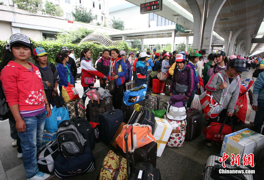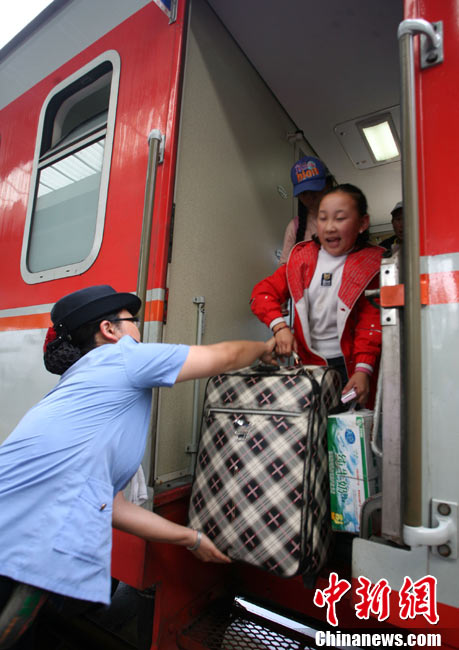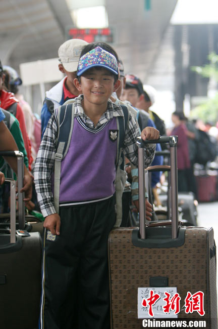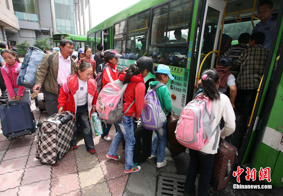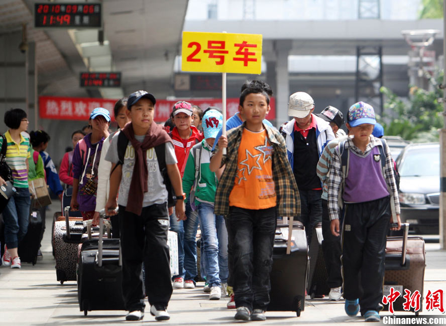 9月6日中午,青海省玉樹州地震災(zāi)區(qū)民族中學(xué)2013級初一、高一486名新生經(jīng)過長途跋涉安全抵達(dá)成都,他們將在四川都江堰八一聚源中學(xué)異地過渡。至此,玉樹州民族中學(xué)成建制轉(zhuǎn)移安置工作全部結(jié)束。圖為玉樹州民族中學(xué)新生抵達(dá)成都火車站。 中新社發(fā) 劉忠俊 攝