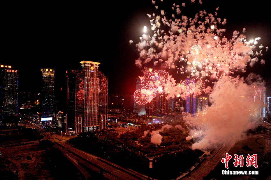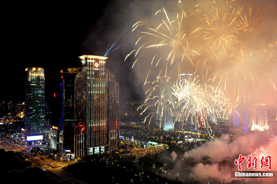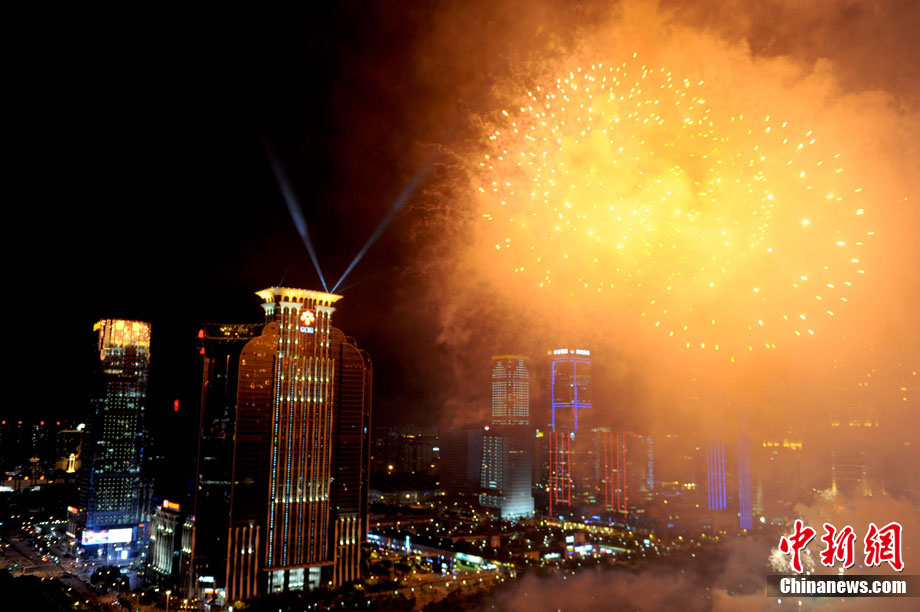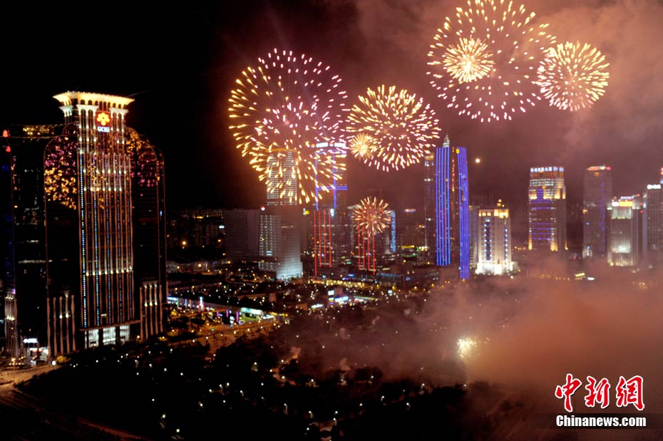 9月6日晚8點30分,深圳夜空璀璨絢麗,慶祝深圳經濟特區(qū)建立30周年焰火晚會在深南大道水晶島舉行。今晚燃放煙花數(shù)量145107發(fā),主要品種19種,全長30分鐘,共四個樂章。深圳市民分別在蓮花山公園、市民中心、深南路、彩田路、會展中心等區(qū)域觀看深圳經濟特區(qū)30周年慶典煙花晚會。中新社記者 陳文 攝