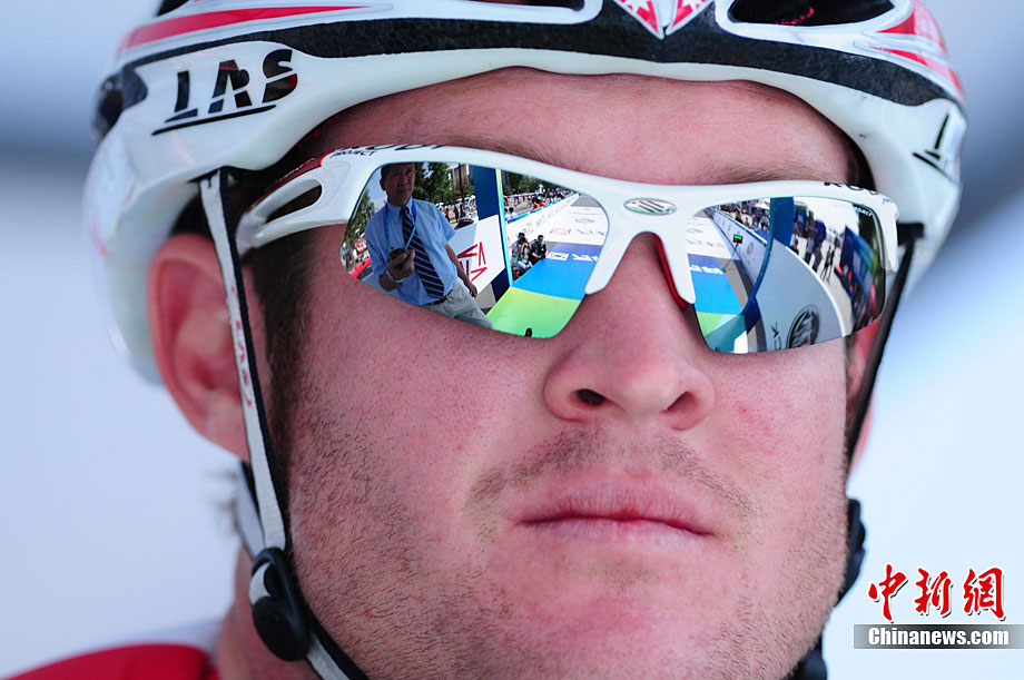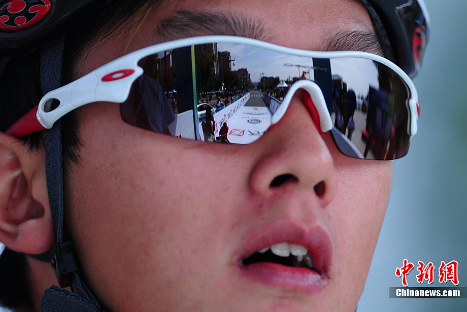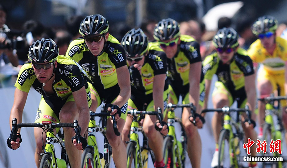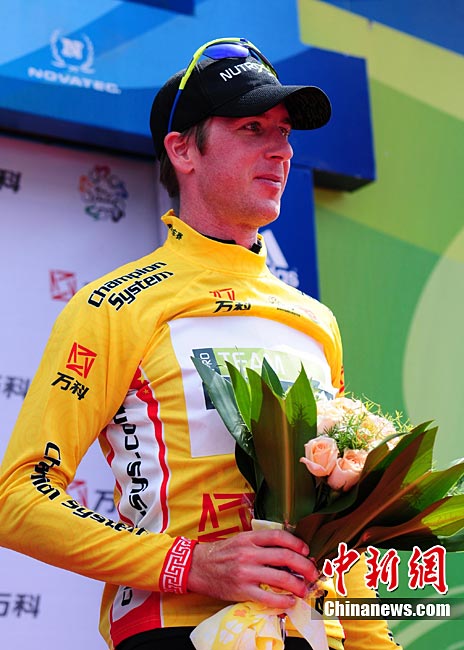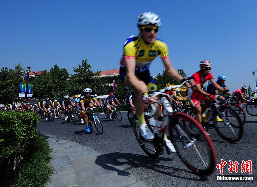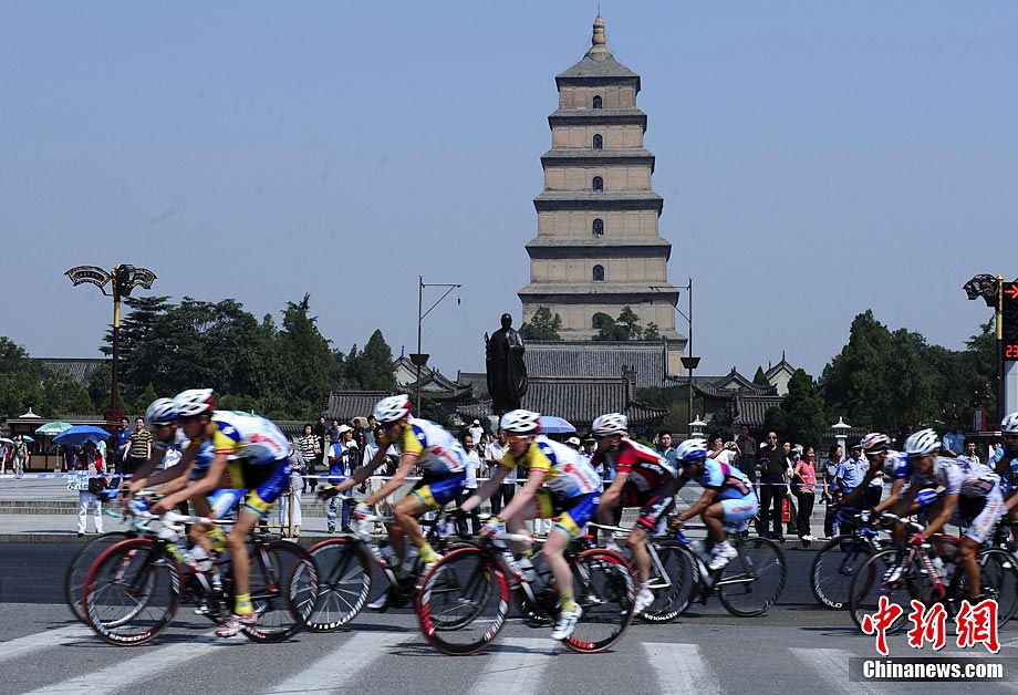 9月10日上午,首屆環(huán)中國國際公路自行車賽序幕賽(個人計時賽)在西安市曲江池畔舉行,結果德國紐特里什車隊的車手德克·穆勒(中)獲得本賽段冠軍,奪得本次比賽的首件黃色領騎衫。中新社記者 侯宇 攝