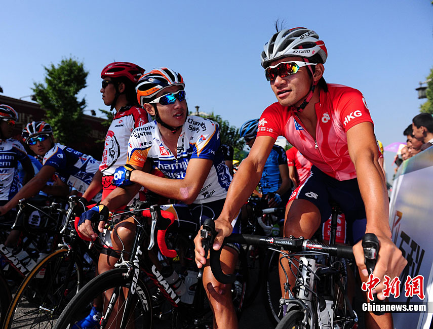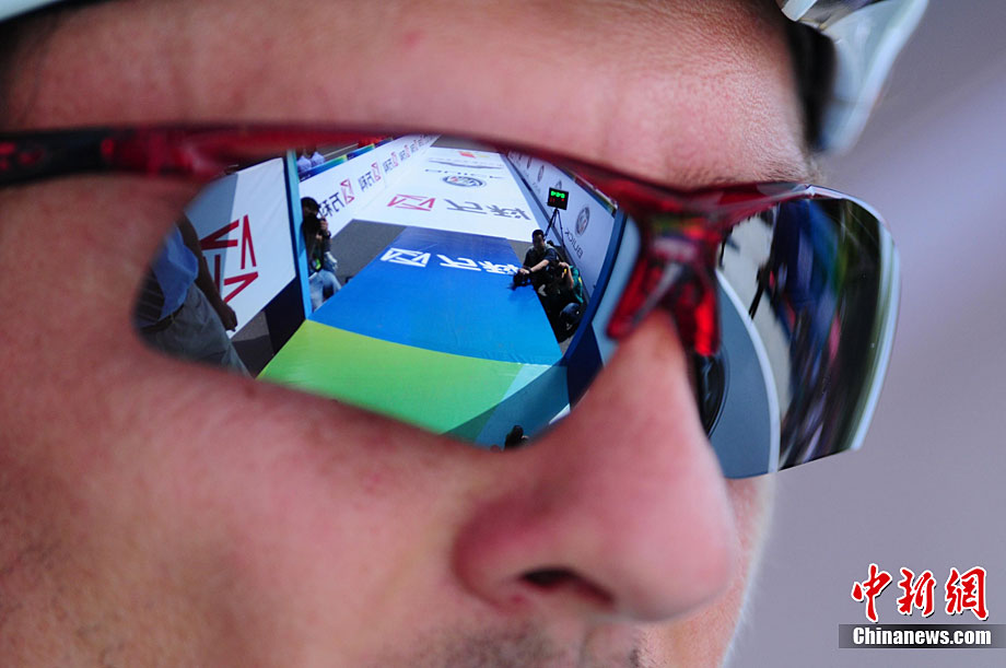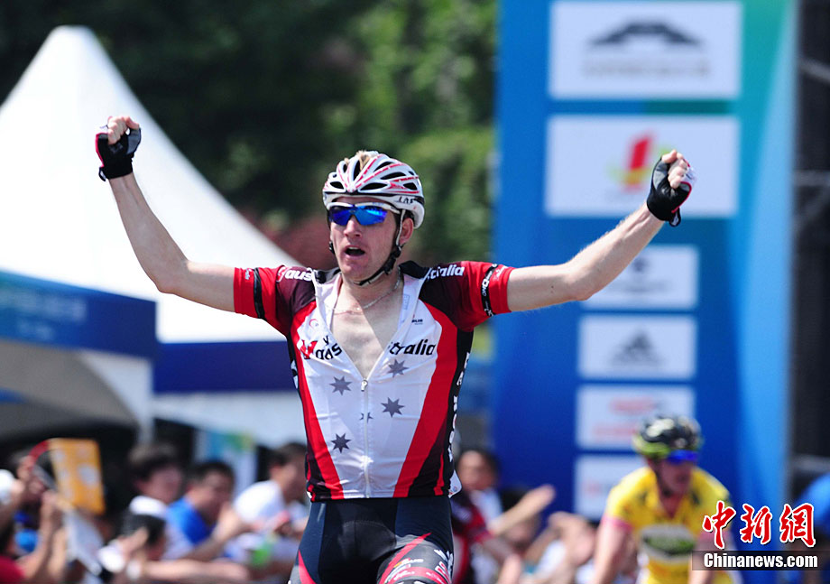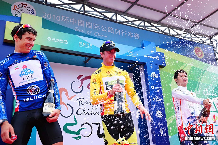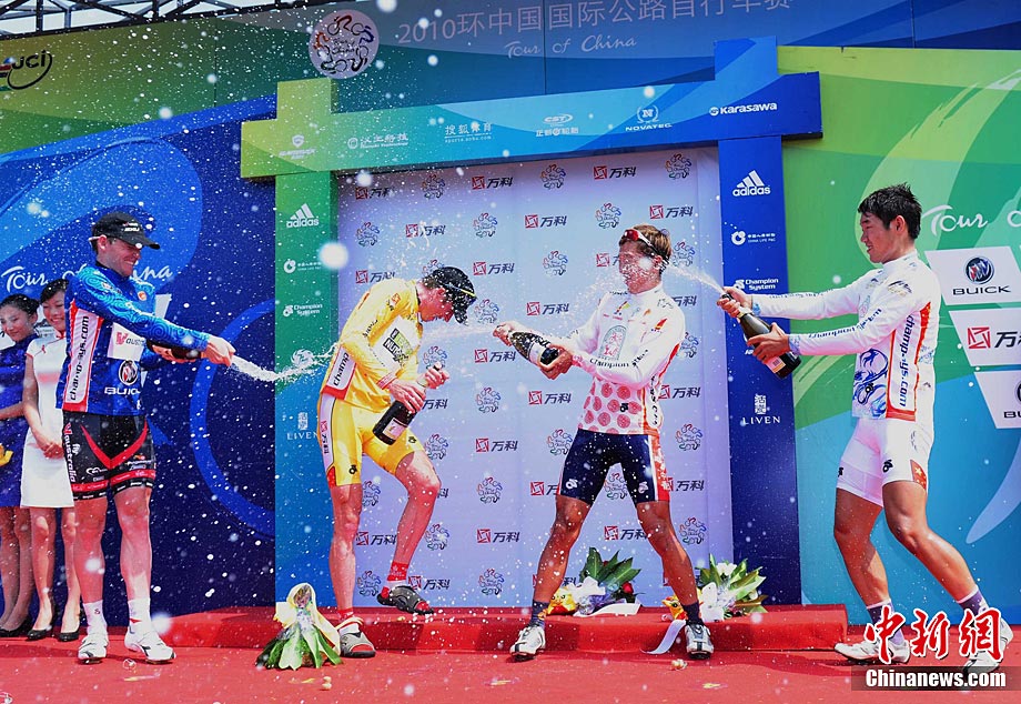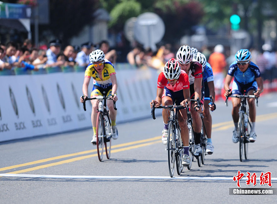 9月10日上午,首屆環(huán)中國國際公路自行車賽序幕賽(個人計時賽)在西安市曲江池畔舉行,結果德國紐特里什車隊的車手德克·穆勒(中)獲得本賽段冠軍,奪得本次比賽的首件黃色領騎衫。中新社記者 侯宇 攝