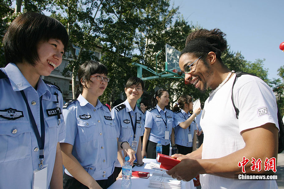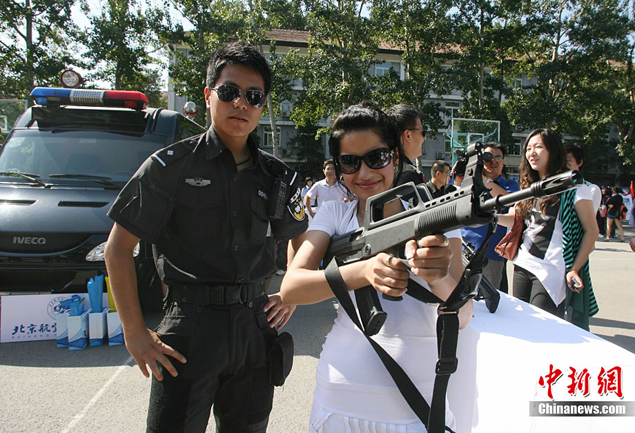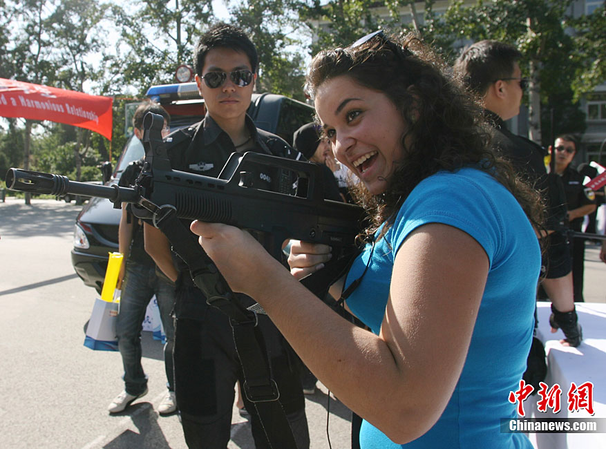 9月11日,北京語言大學(xué)一留學(xué)生在北京特警的講解下試用新型警用槍支。當(dāng)日,北京市公安局在北京語言大學(xué)舉辦“平安北京進(jìn)校園”主題活動。民警通過面對面的交流為外國留學(xué)生提供咨詢服務(wù),用英、德、西、日、韓5種語言,解答外國留學(xué)生在京居留、學(xué)習(xí)生活方面的各種問題,致力于提高外國留學(xué)生的安全感和滿意度。中新社發(fā) 蘇丹 攝