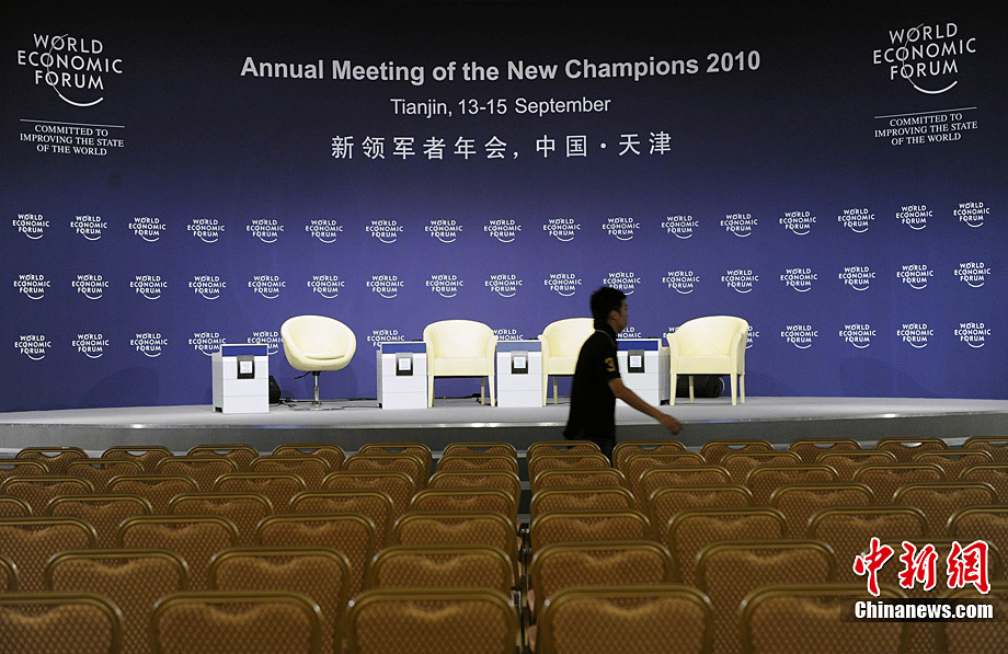 9月12日,2010夏季達(dá)沃斯各項(xiàng)籌備就緒,靜待明日開幕。近90個(gè)國家的超過1500名代表云集天津,將圍繞“推動(dòng)可持續(xù)增長”這一主題展示各自真知灼見。中新社記者 劉震 攝