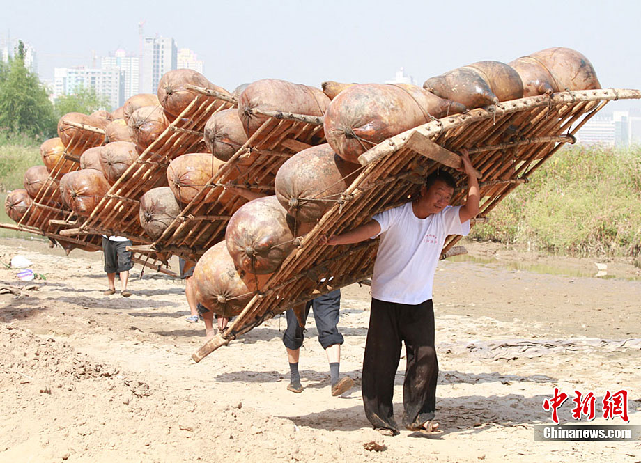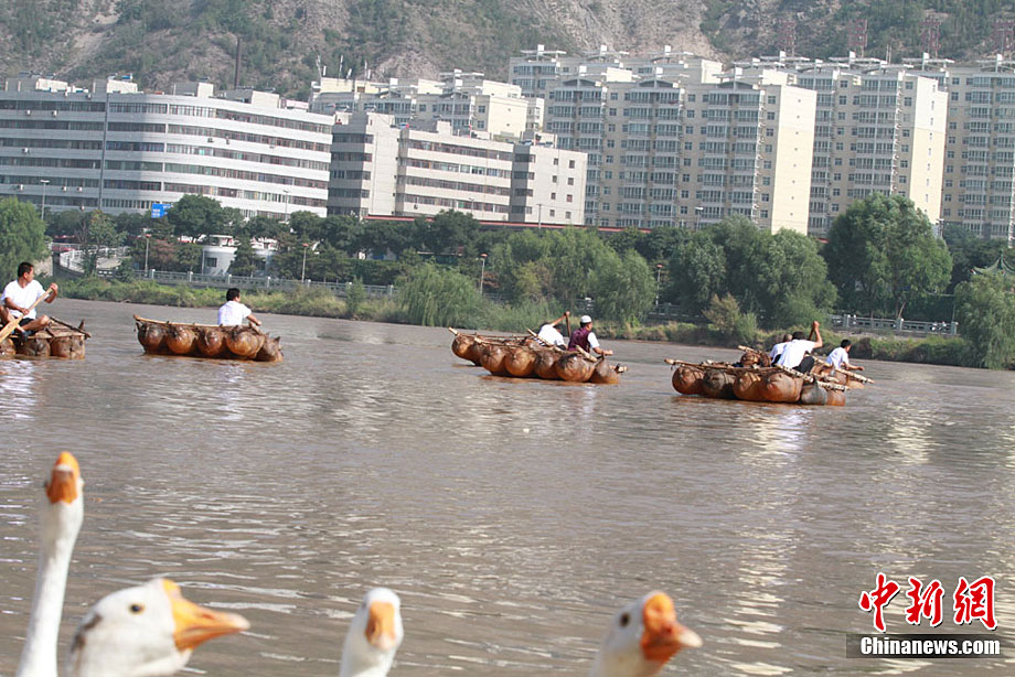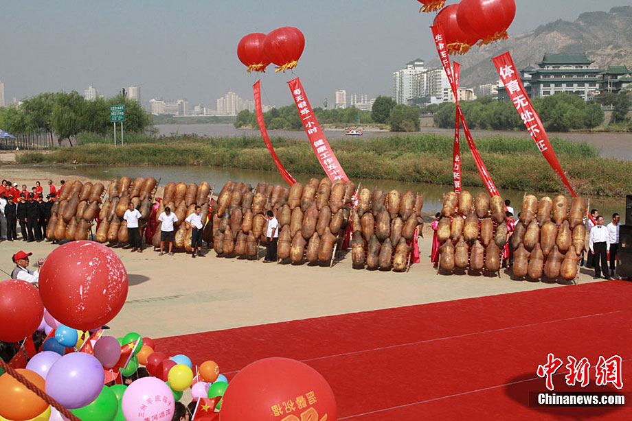9月13日,蘭州第二屆羊皮筏子黃河漂流活動隆重舉行。羊皮筏子俗稱“排子”,是用山羊割去頭蹄,然后將囫圇脫下的羊皮扎口、吹滿氣而扎成,是一種古老的水運工具,如今已經(jīng)被淘汰,嬗變成當(dāng)?shù)匾环N旅游項目。中新社記者 殷春永 攝