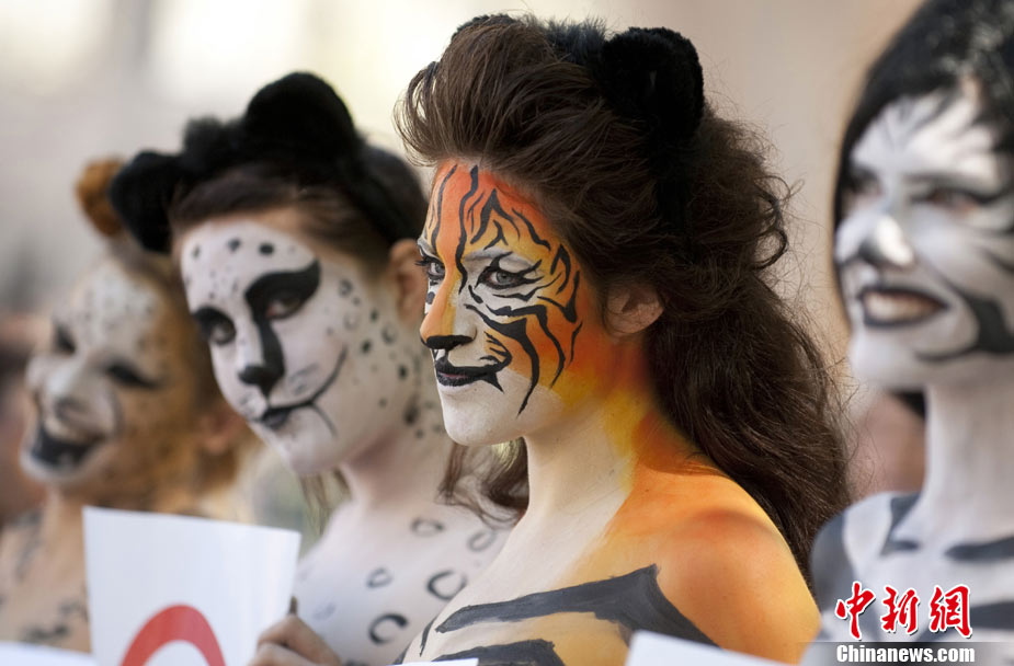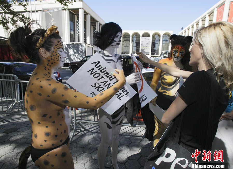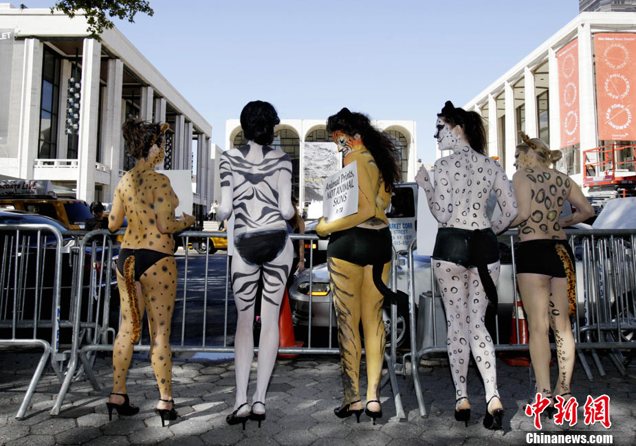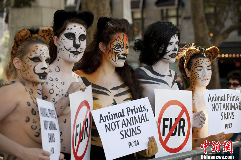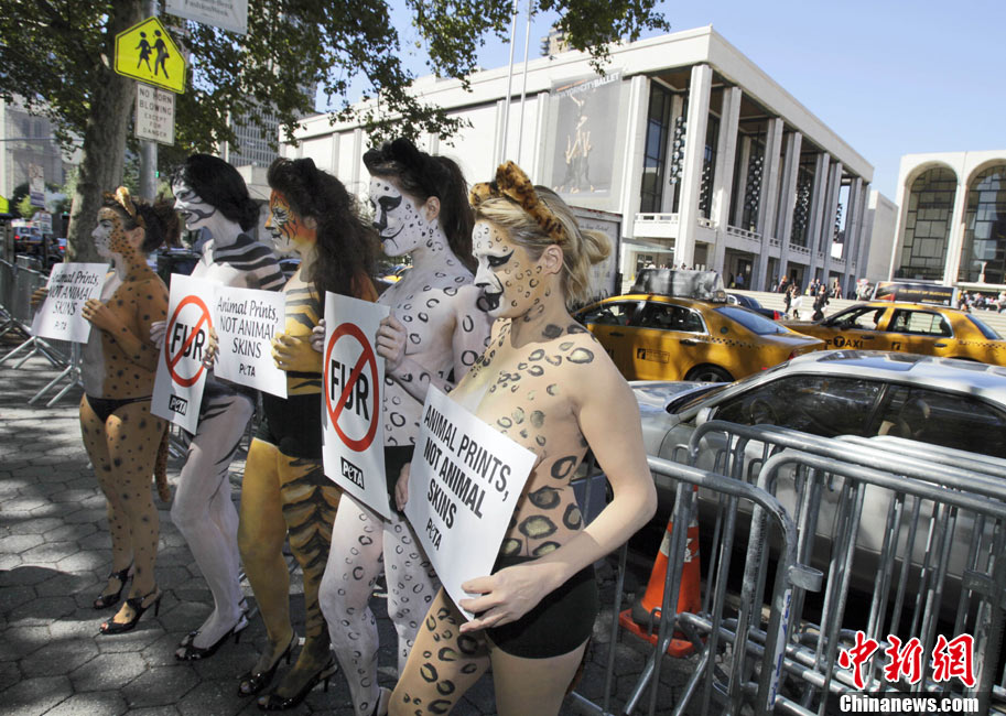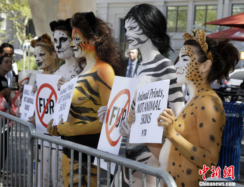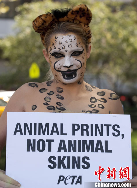 9月14日,在紐約時(shí)裝周進(jìn)行期間,幾位環(huán)保愛(ài)好者在身上涂畫“動(dòng)物彩繪”,呼吁保護(hù)動(dòng)物,愛(ài)護(hù)環(huán)境。