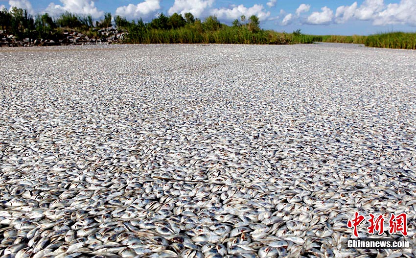 近日,人們在美國路易斯安那州普拉克明縣發(fā)現(xiàn)大批漂浮在緩流溪上的死亡魚群。目前,這批魚的死亡原因不明,但懷疑與墨西哥灣漏油事件有關(guān)。圖為9月10日在美國路易斯安那州普拉克明縣拍攝的大批死魚。
