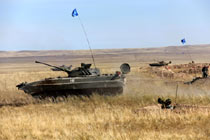 當(dāng)?shù)貢r(shí)間9月15日,“和平使命-2010”上海合作組織成員國(guó)武裝力量聯(lián)合反恐軍事演習(xí),按計(jì)劃在哈薩克斯坦馬特布拉克訓(xùn)練場(chǎng)成功進(jìn)行聯(lián)演戰(zhàn)役準(zhǔn)備階段的第二次合練——無(wú)彈藥消耗全員全裝實(shí)兵合練,旨在按演習(xí)科目和進(jìn)程,開展實(shí)兵現(xiàn)地推演。圖為參演坦克出動(dòng)。中新社記者 孫自法 攝