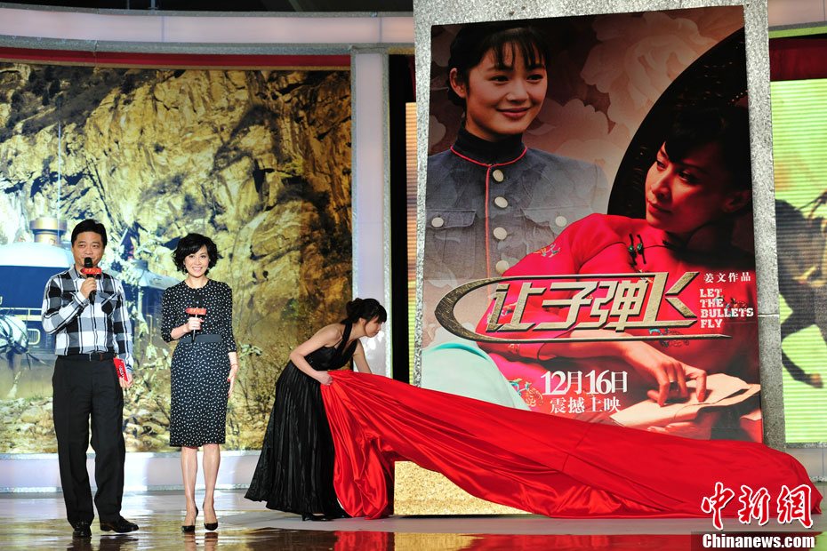 9月16日,將于12月26日震撼上映的電影《讓子彈飛》導演姜文攜主演劉嘉玲、廖凡、邵兵亮相北京,為即將上映的新作站臺宣傳。當回答“票房預期”時,姜文自信的表示“我們這個戲里有葛優(yōu),有周潤發(fā),以前別人說一個電影‘不優(yōu)不發(fā)’或者說‘不發(fā)不優(yōu)’。那我們這個片子里又有(葛)優(yōu)又有(周潤)發(fā),我都不敢想能賣多少了! 女主角劉嘉玲在片中“情挑”姜文、周潤發(fā)、葛優(yōu)三影帝。她更是對《讓子彈飛》成為今年內(nèi)地票房冠軍充滿信心,表示假如梁朝偉《一代宗師》趕上賀歲檔,樂意打敗他們。