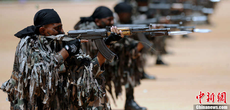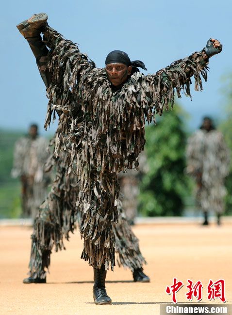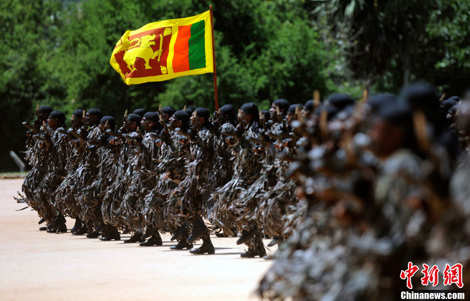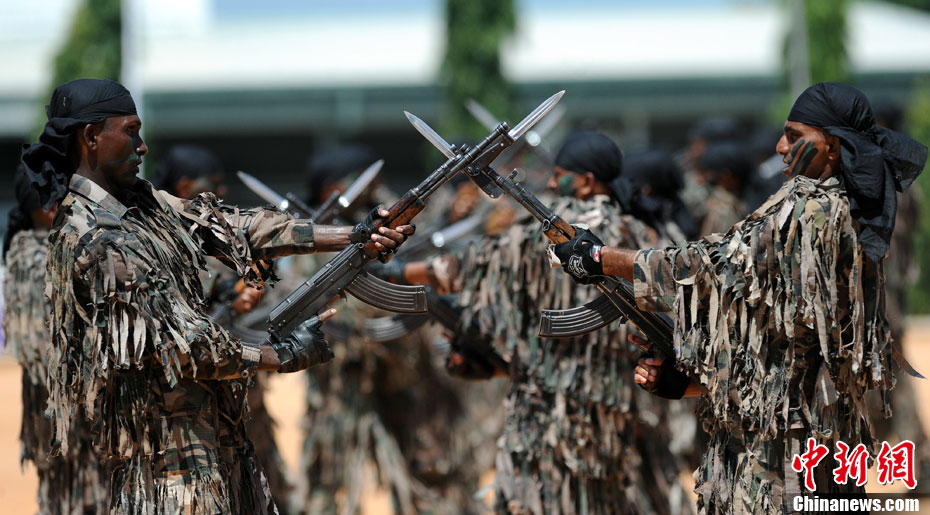 9月17日,在斯里蘭卡東北部城市亭可馬里舉行的空軍閱兵儀式上,116名空軍特種兵展示他們的各項(xiàng)技能。自2009年泰米爾猛虎組織(全稱,泰米爾·伊拉姆猛虎解放組織)的首領(lǐng)普拉巴卡蘭被擊斃,其基地被政府軍攻陷后,斯里蘭卡結(jié)束了長達(dá)25年的內(nèi)戰(zhàn),軍隊(duì)實(shí)力不斷增加。