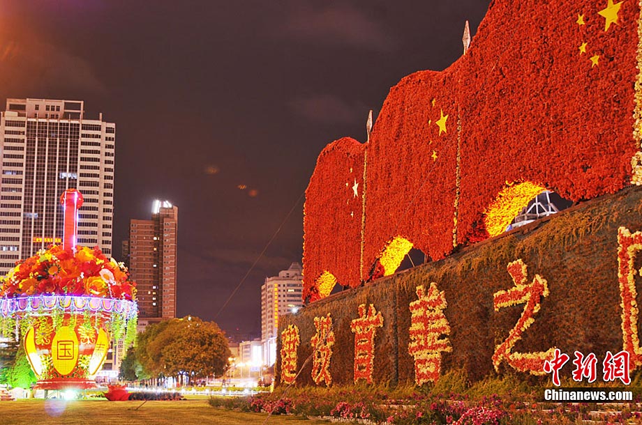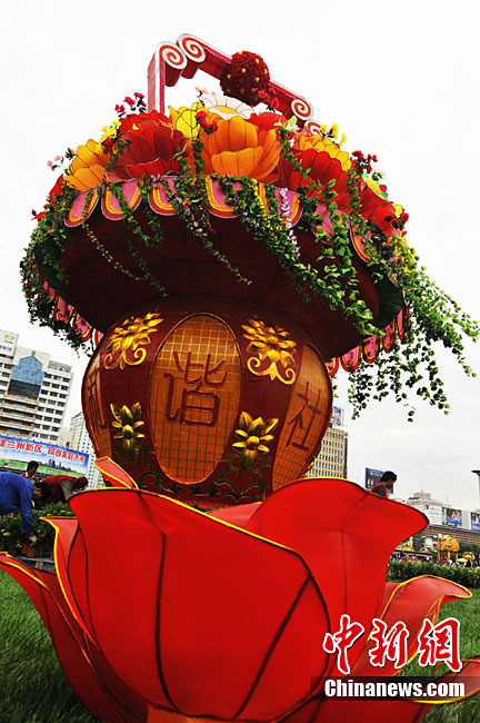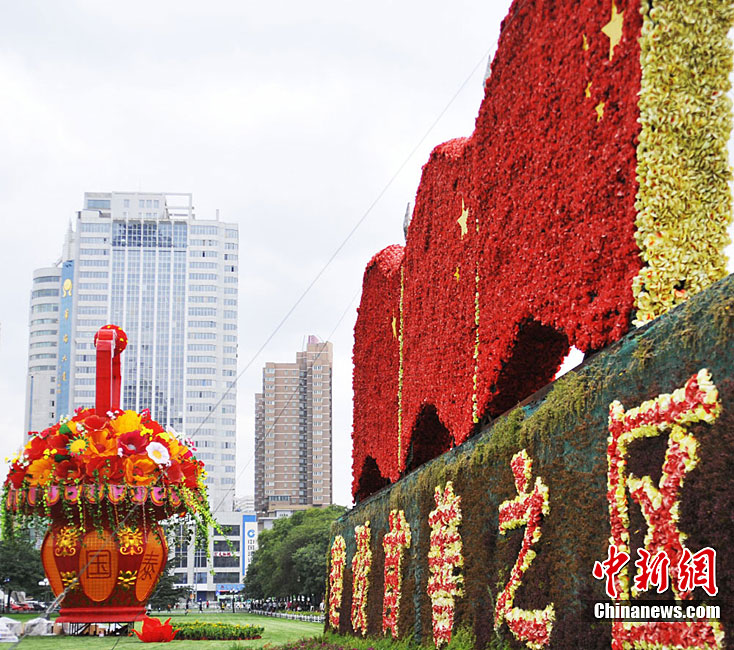 9月20日,中秋、國慶雙節(jié)即將到來,蘭州東方紅廣場布置一新,花籃上標(biāo)注有“和諧社會”與“國泰民安”。 楊艷敏 攝