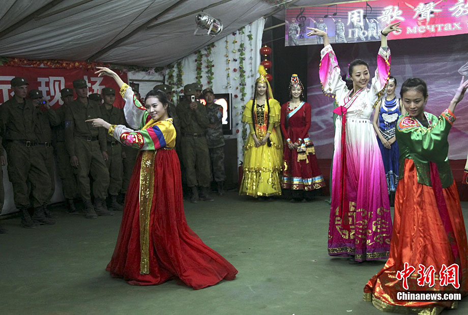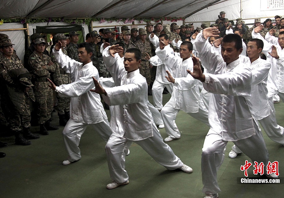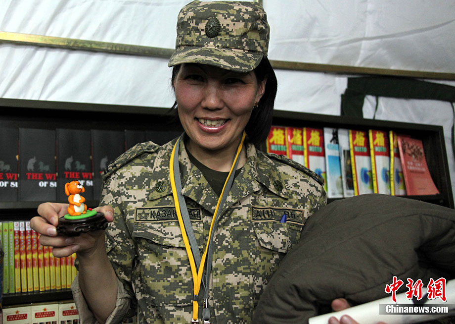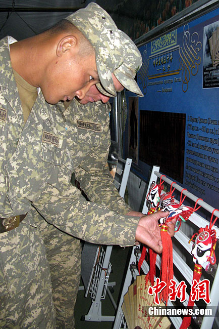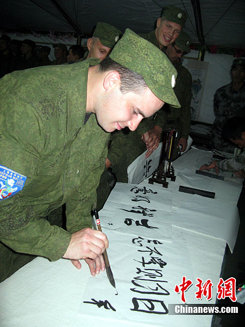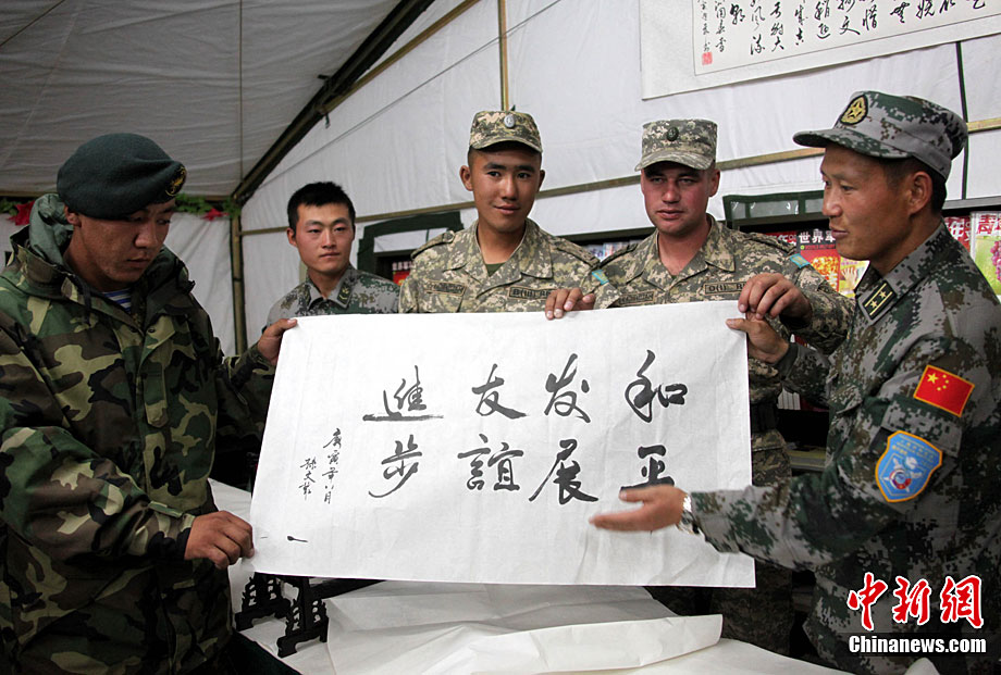 9月20日是“和平使命-2010”聯(lián)演確定的中國民族文化日,當(dāng)?shù)貢r(shí)間黃昏時(shí)分至晚上,哈薩克斯坦、俄羅斯、塔吉克斯坦、吉爾吉斯斯坦參演部隊(duì)官兵應(yīng)邀先后來到中方野戰(zhàn)兵營內(nèi)的“民族文化屋”帳蓬,觀賞、體驗(yàn)博大精深的中國文化。圖為中方參演官兵現(xiàn)場揮毫并將書法作品贈(zèng)送給哈方官兵。中新社記者 孫自法 攝