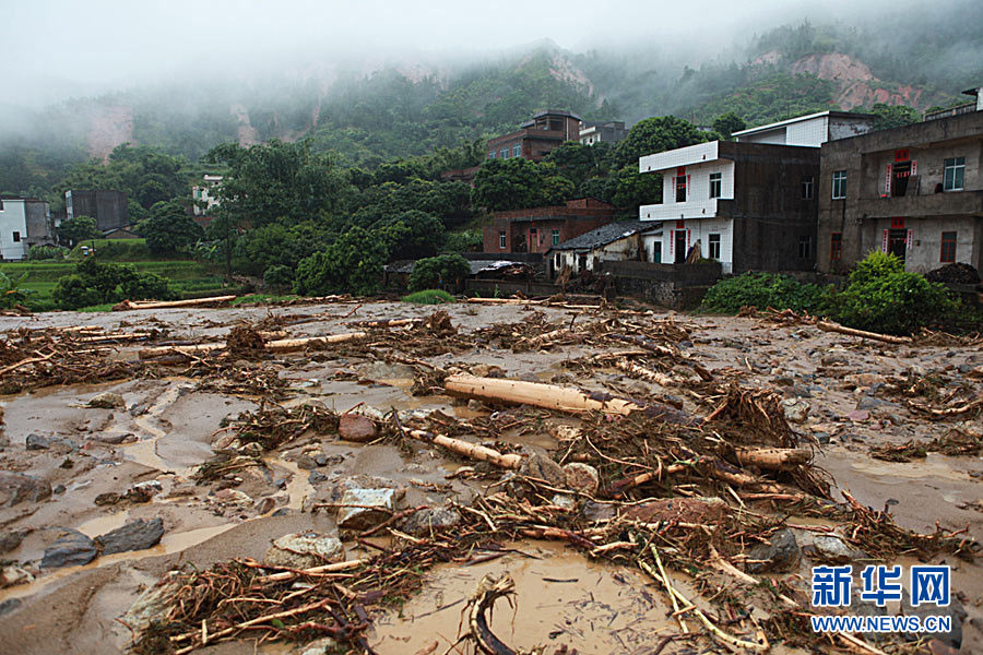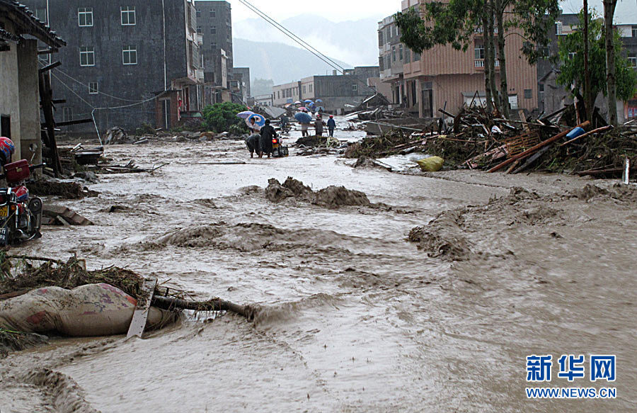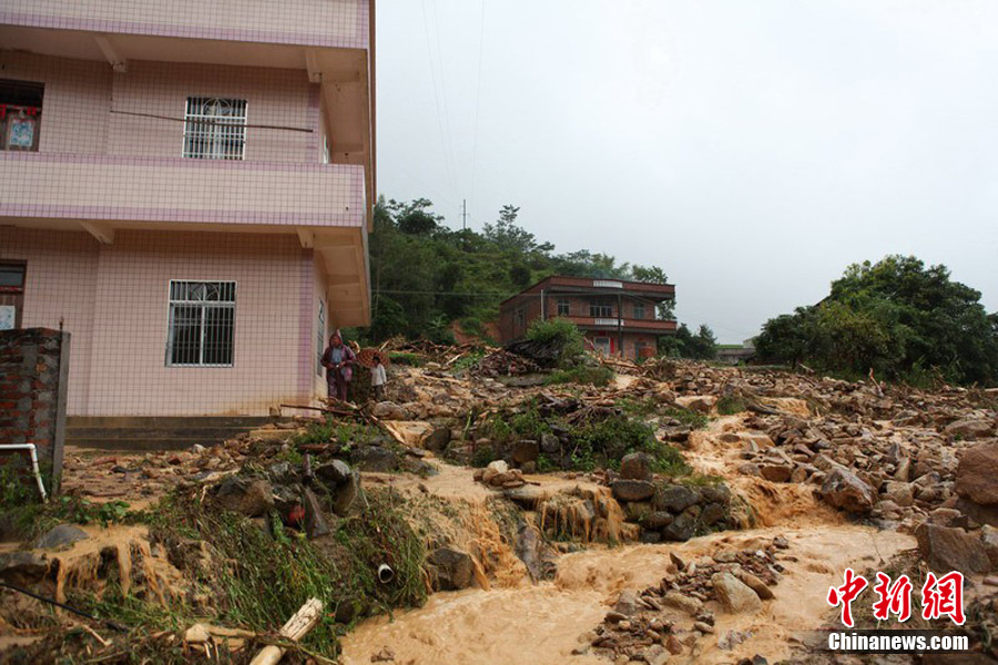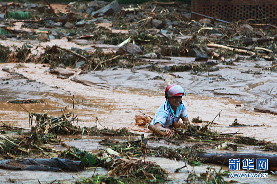 據廣東省防總消息,截至21日23時,“凡亞比”造成廣東高州市、信宜市、陽春市三市共死亡13人,失蹤33人。圖為暴雨引發(fā)山洪災害。中新社發(fā) 聞達 攝