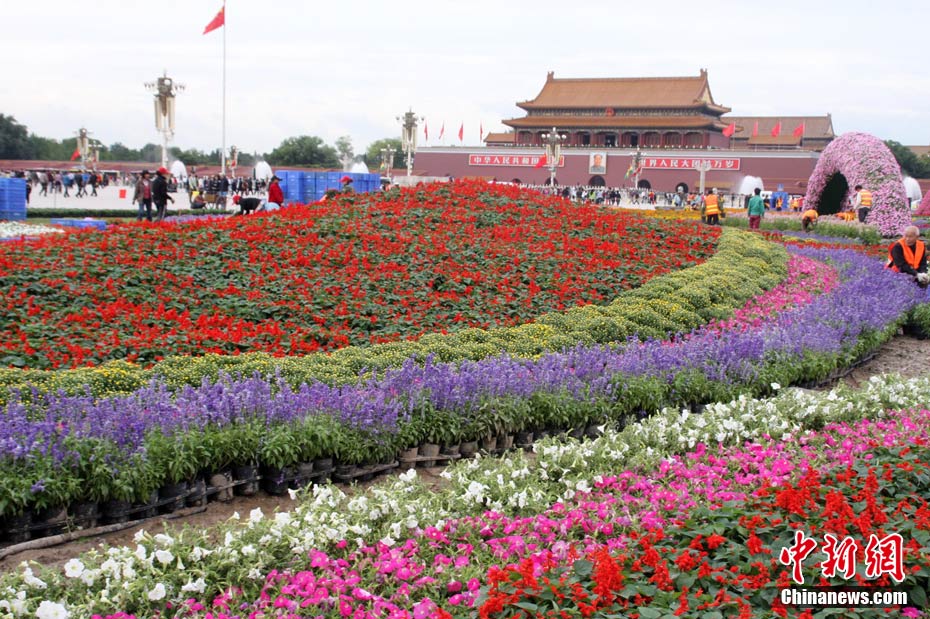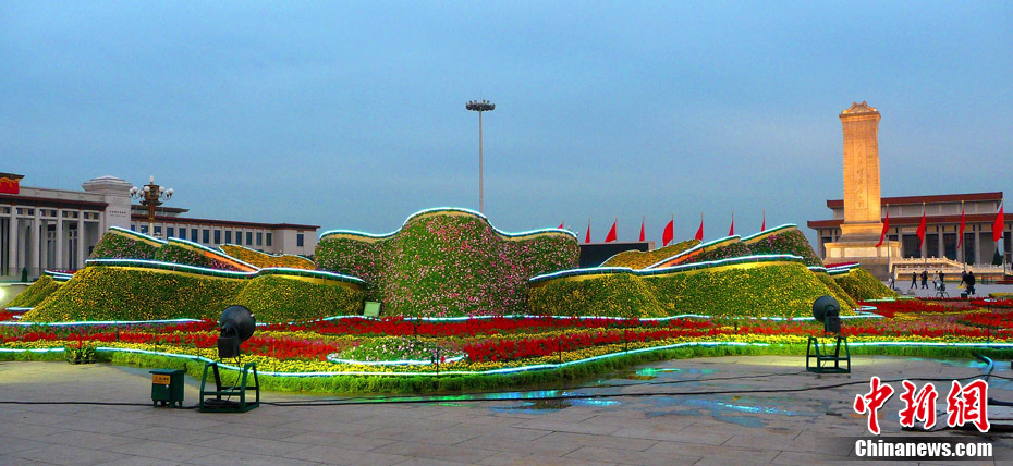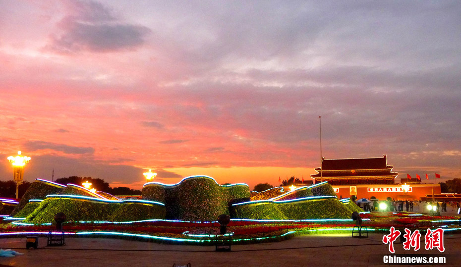 9月21日傍晚,北京天安門廣場,剛剛布置完畢的國慶中心花壇首次調(diào)試景觀照明,綻放的“牡丹”與晚霞交相輝映。 中新社發(fā) 玉龍 攝 圖片來源:cnsphoto