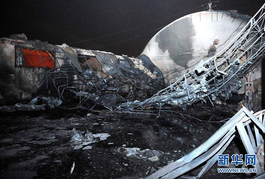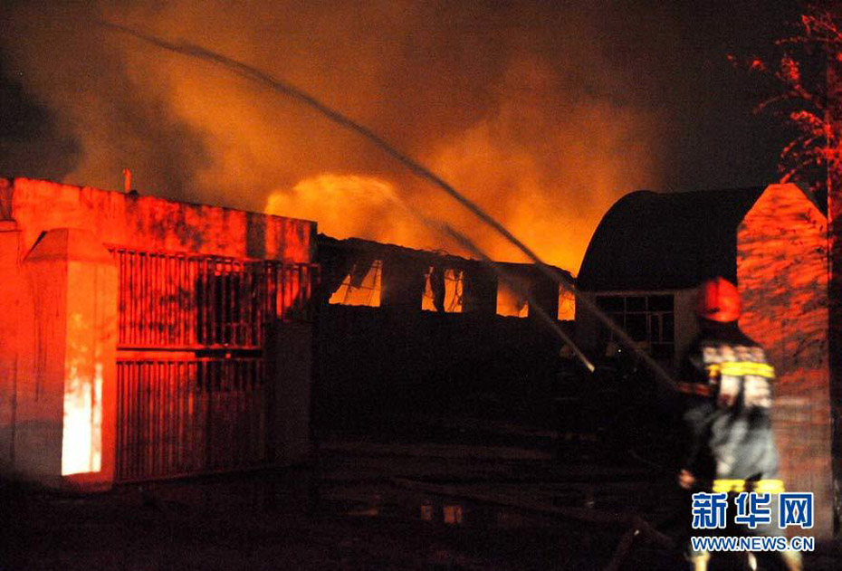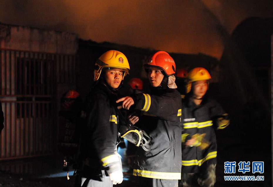 9月25日,消防官兵在火災現(xiàn)場進行撲救。當日晚間,烏魯木齊國際機場跑道東側(cè)圍墻外一家“恒利擠塑板廠”發(fā)生火災并有爆炸,由于有爆炸物散落到機場跑道,烏魯木齊國際機場關(guān)閉了一個小時,清理跑道。圖片來源:新華網(wǎng) 王菲 攝