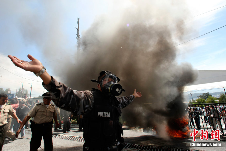 厄瓜多爾當(dāng)?shù)貢r(shí)間9月30日爆發(fā)嚴(yán)重騷亂,目前,厄瓜多爾局勢(shì)十分緊張,抗議者一度控制首都基多的國際機(jī)場(chǎng),并試圖攻占國會(huì)大廈。在厄瓜多爾的其他地方也出現(xiàn)嚴(yán)重騷亂,多個(gè)城市間的交通被切斷。圖為在厄瓜多爾首都基多街頭,一名警官參加示威游行。