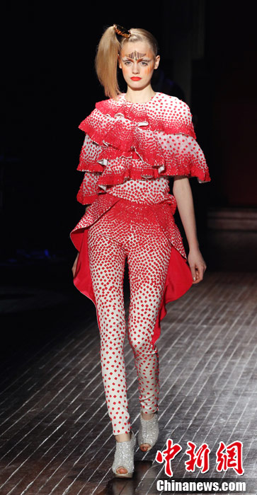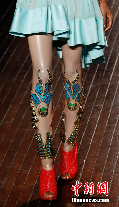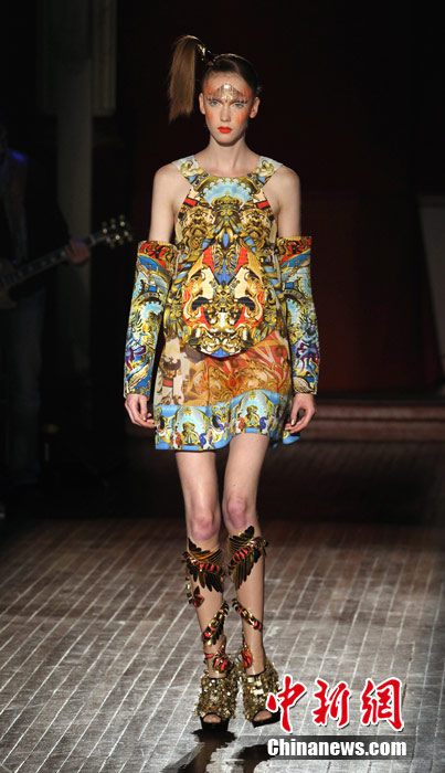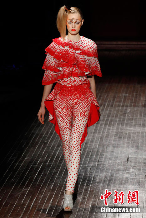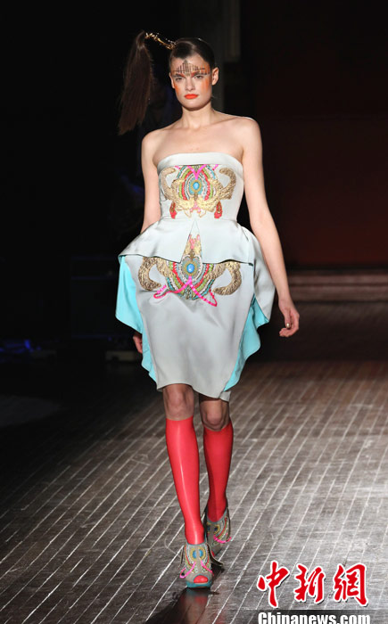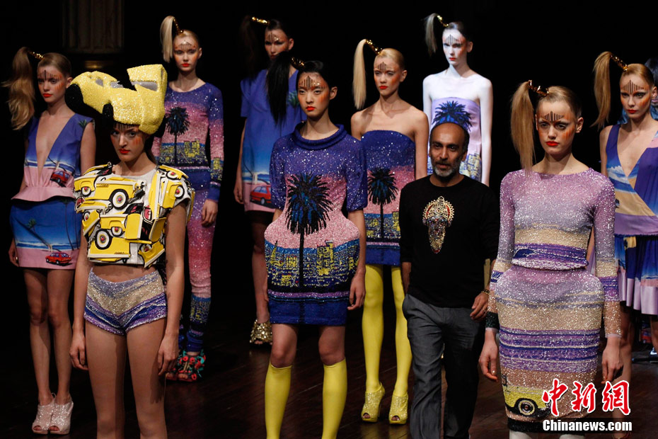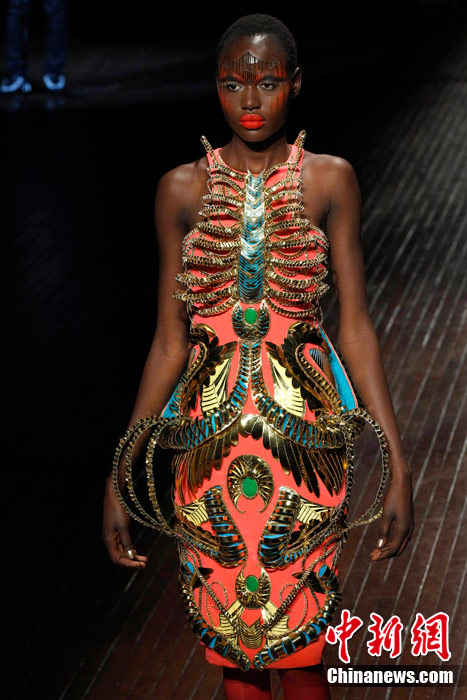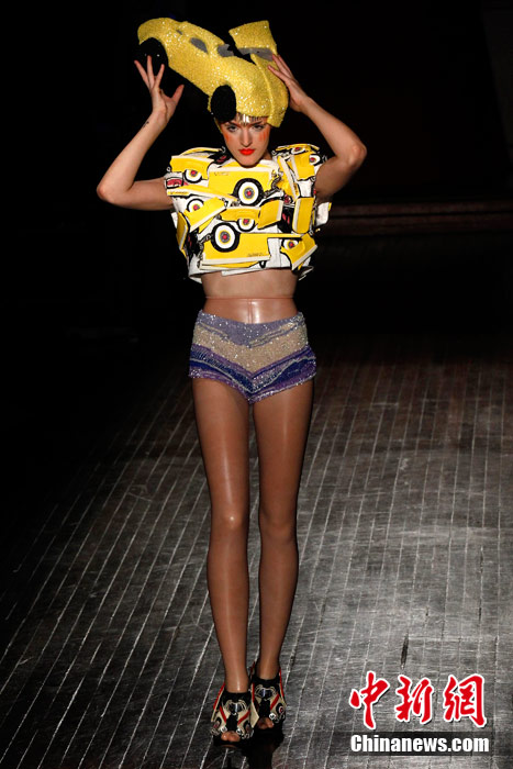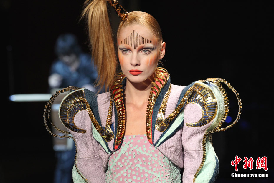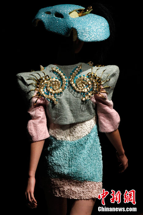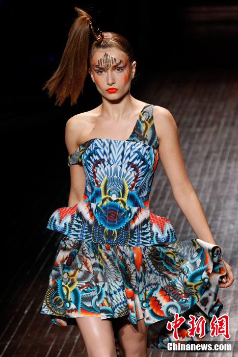 9月30日,巴黎時裝周上,模特在展示印度設(shè)計師曼尼詩·阿羅拉(Manish Arora)的作品。大膽鮮艷的另類風(fēng)格,讓人耳目一新。