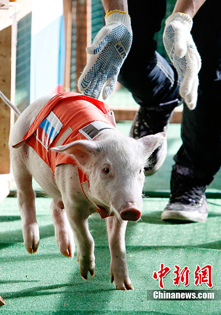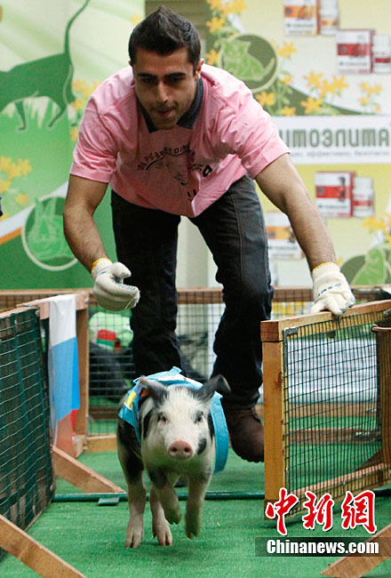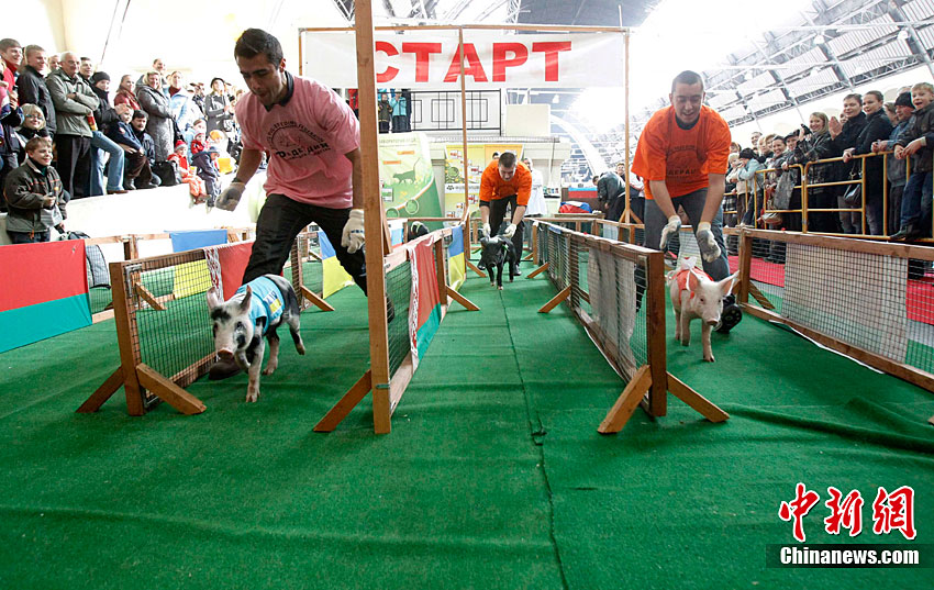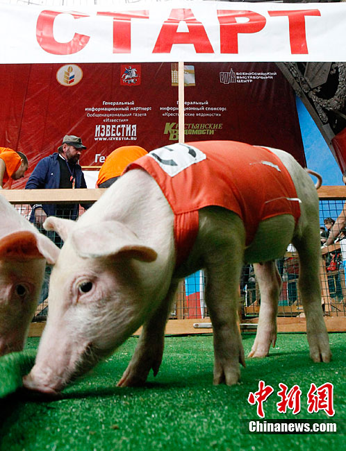 當地時間10月2日,俄羅斯莫斯科舉行了一場別開聲面的豬仔賽跑比賽,這是俄羅斯“金秋-2010”農業(yè)成就展上的一部分。