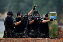 10月8日,中國、泰國兩軍特種部隊(duì)“突擊—2010”反恐聯(lián)合訓(xùn)練在廣西桂林拉開帷幕,這是兩國之間舉行的第三次陸軍聯(lián)合訓(xùn)練。分析人士指出,這次聯(lián)訓(xùn)將進(jìn)一步鞏固兩軍關(guān)系,提高聯(lián)合反恐作戰(zhàn)能力,利于維護(hù)地區(qū)和平穩(wěn)定。此次聯(lián)訓(xùn)為期15天,這是中泰兩國陸軍首次就城市反恐課題開展聯(lián)訓(xùn)。圖為泰國參訓(xùn)部隊(duì)在開幕式上表演泰拳。中新社記者 杜洋 攝