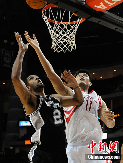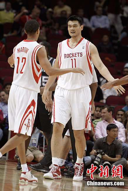 10月7日,美國休斯敦,10/11NBA季前賽,休斯敦火箭90-87圣安東尼奧馬刺。姚明上場12分48秒,8投2中得5分7個(gè)籃板,并有3次出色的蓋帽。