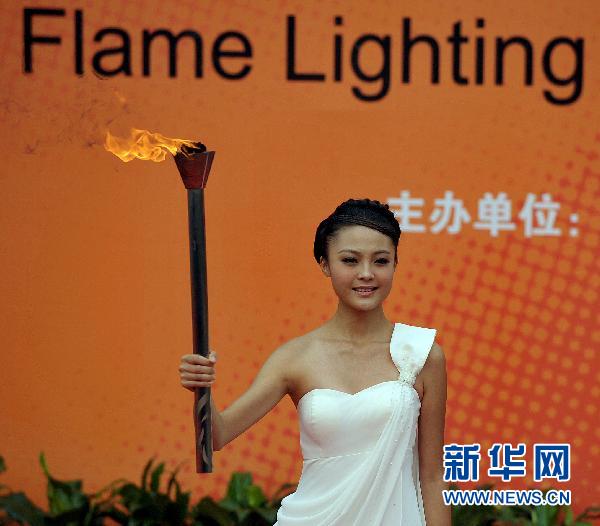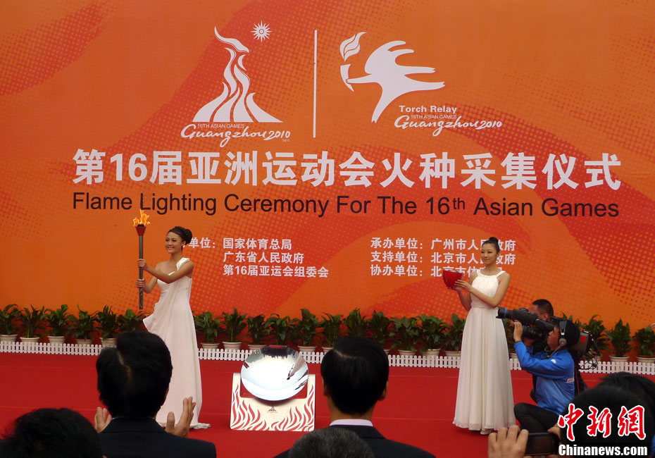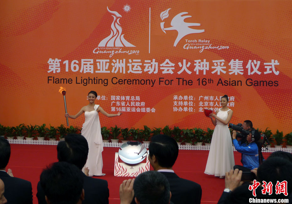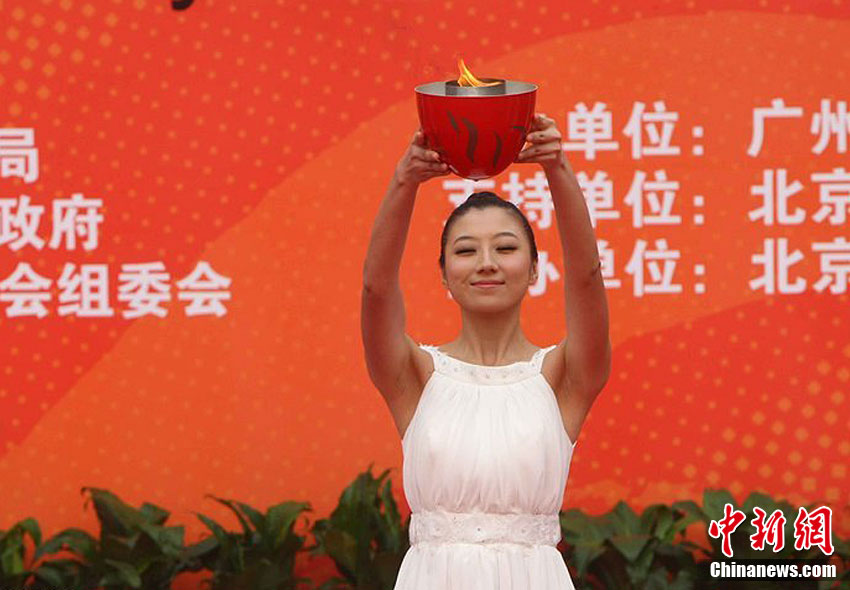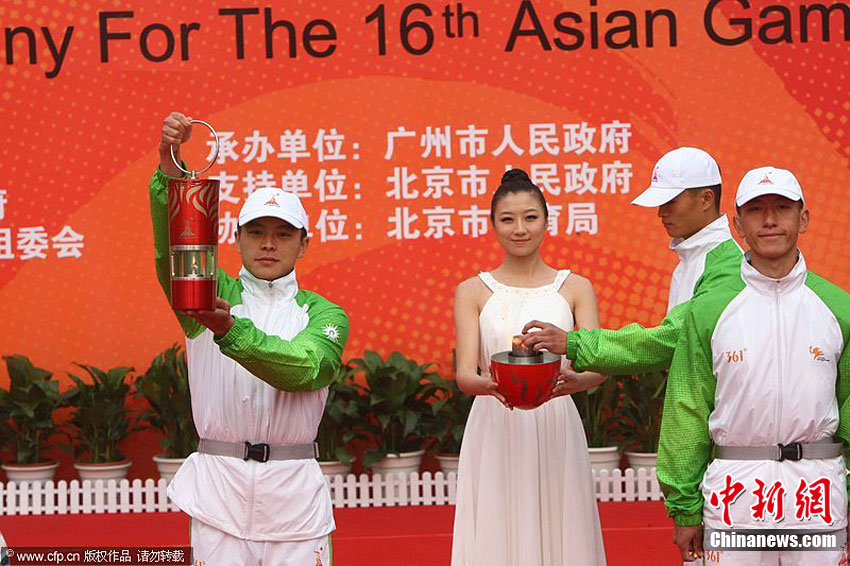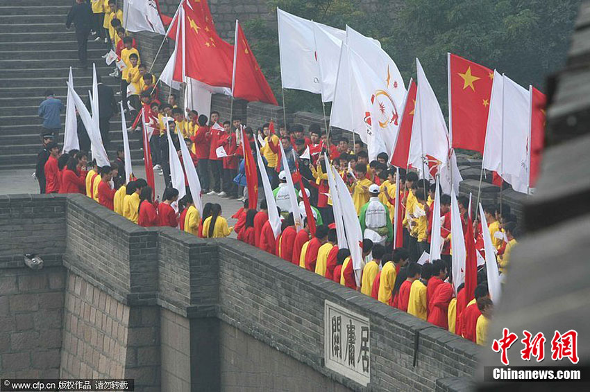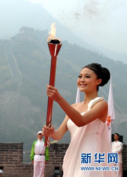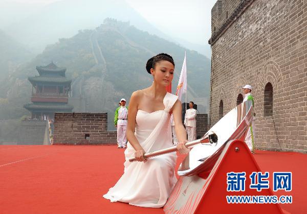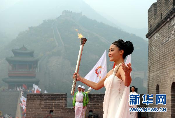 北京時(shí)間10月9日上午10時(shí)26分,2010年廣州亞運(yùn)會圣火在有“天下第一雄關(guān)”的北京居庸關(guān)長城北關(guān)烽火臺成功點(diǎn)燃。中新社記者 王歡 攝