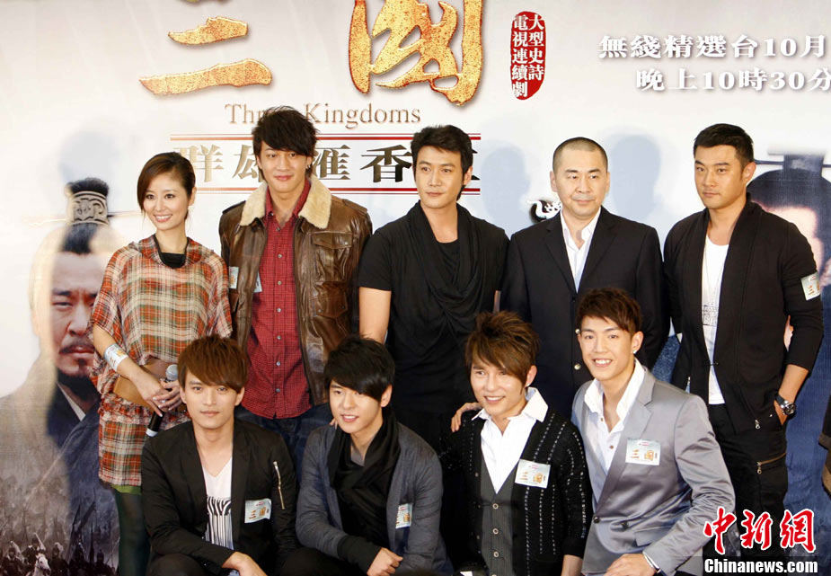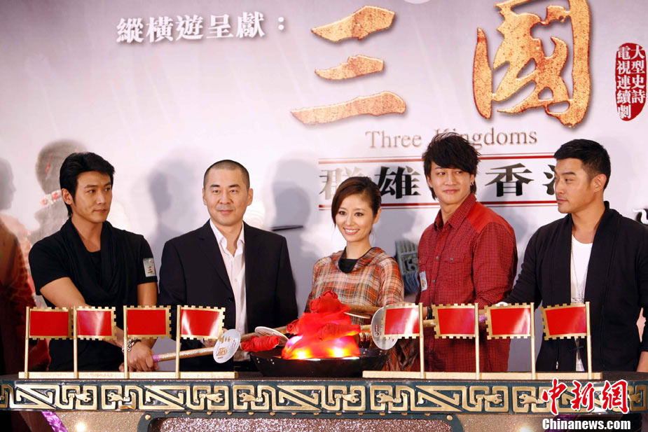 耗資過億元,籌備長達(dá)5年,云集內(nèi)地、香港、臺灣著名演員傾力演出的《三國》歷史劇,將在香港開播。10月9日,該劇主角演員(左起)陸毅、陳建斌、林心如、何潤東及黃維德匯集香港,登臺主持《烽火英雄會儀式》勢掀《三國》劇熱潮。中新社發(fā) 洪少葵 攝