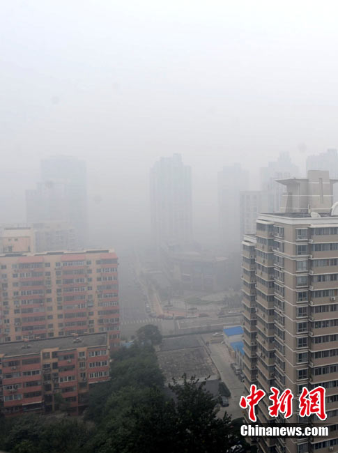 10月10日上午,北京東三環(huán)國貿(mào)橋被大霧籠罩。當日,持續(xù)的大霧再度襲擊北京城,中央氣象臺10月10日06時繼續(xù)發(fā)布大霧藍色預警。中新社發(fā) 馬毅行 攝 圖片來源:CNSPHOTO
