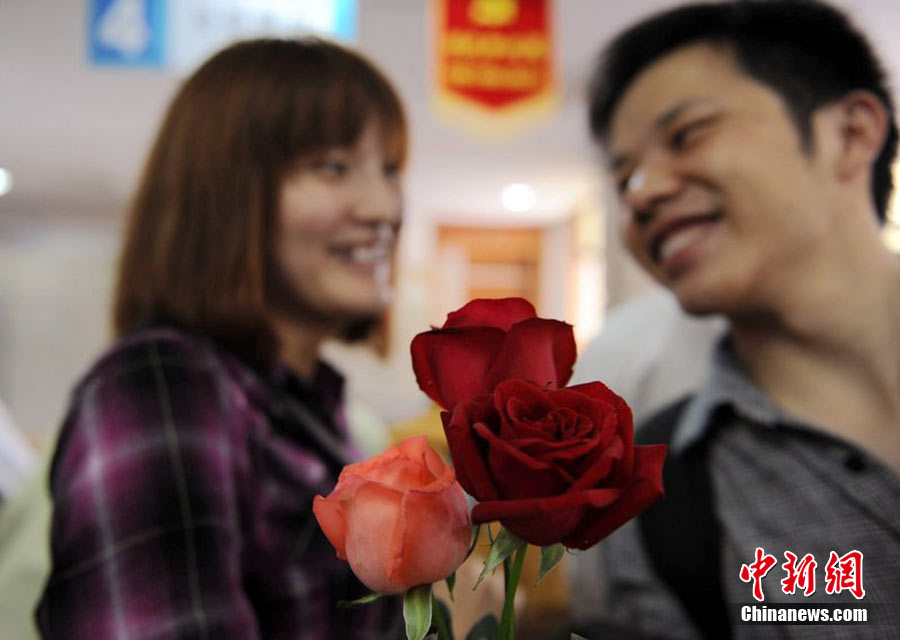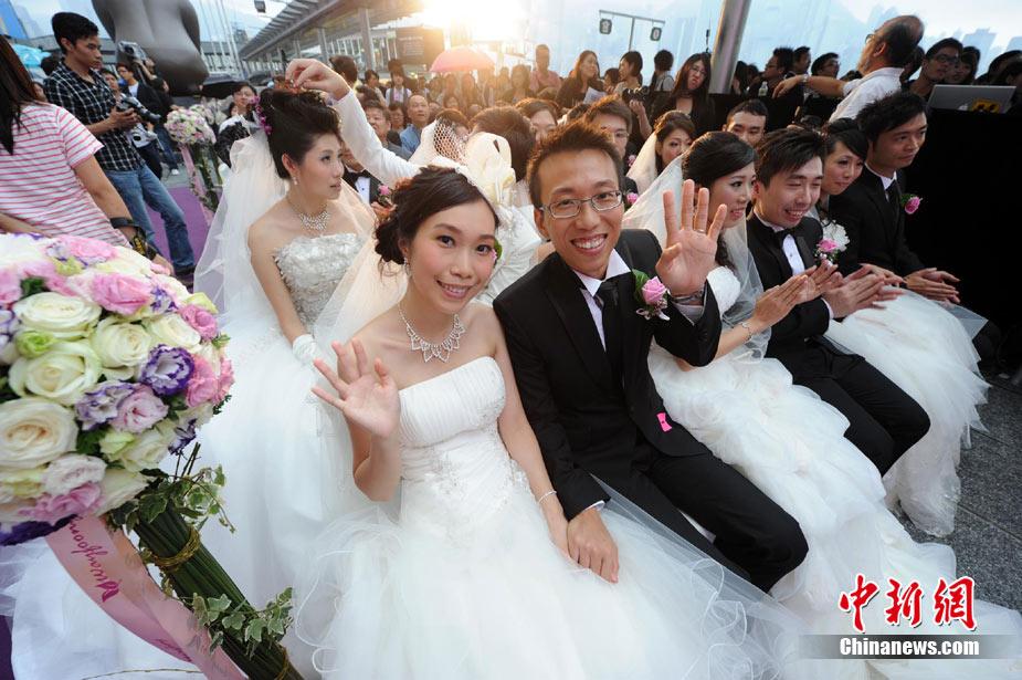 2010年10月10日,全國各地新人辦理結(jié)婚登記。很多新人選擇被寓意“十全十美”的好日子領(lǐng)結(jié)婚證。圖為鄭州出現(xiàn)結(jié)婚登記高峰,導(dǎo)致各區(qū)民政局婚姻登記處門前都排起長長的隊(duì)伍。一對新人在長長的隊(duì)伍中手挽手排除等候。沙浪 攝 圖片來源:CFP視覺中國