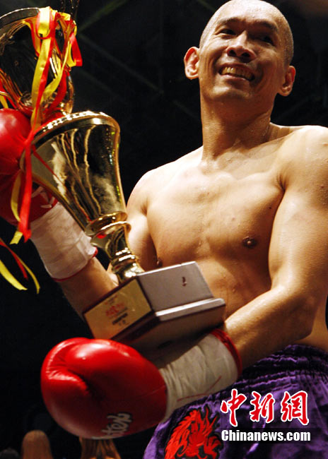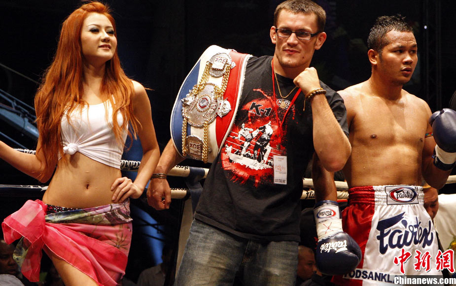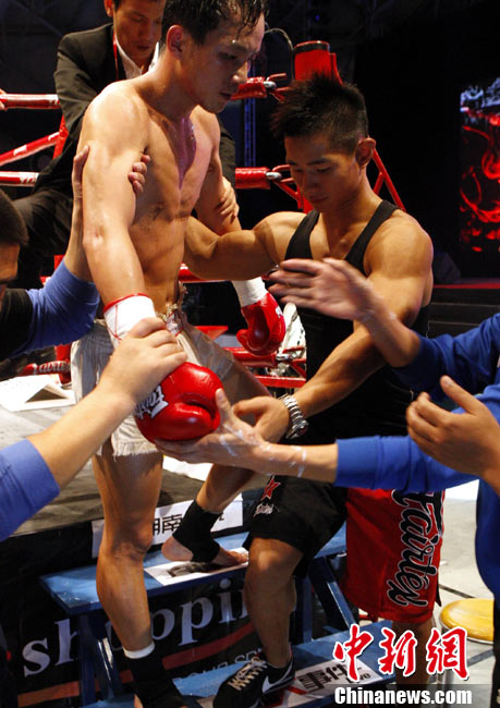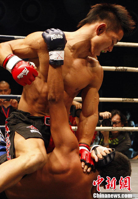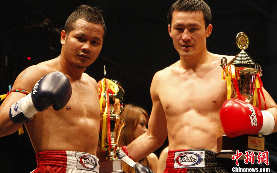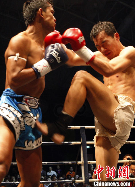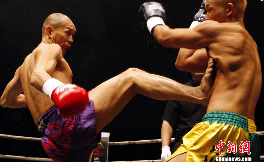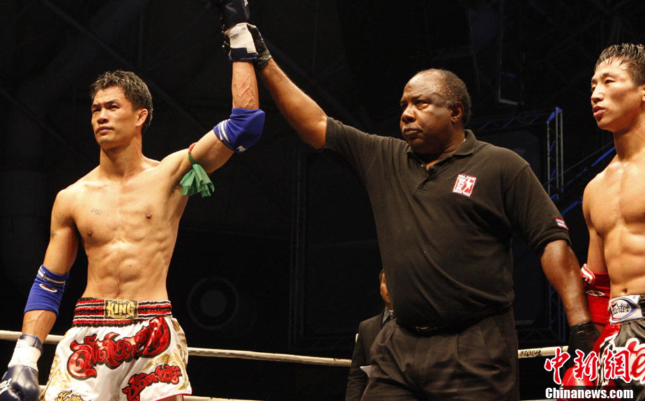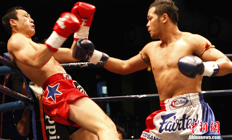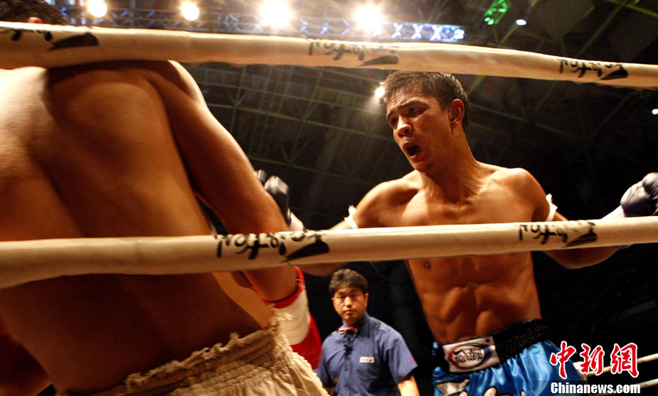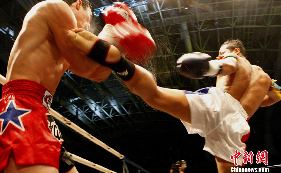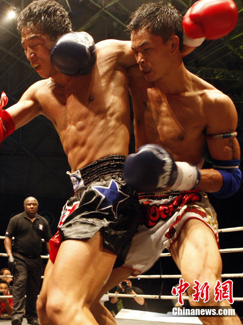 10月9日晚,由馬來(lái)西亞IPC國(guó)際集團(tuán)和中國(guó)國(guó)際文化傳播中心以及英雄傳說(shuō)賽事機(jī)構(gòu)聯(lián)手主辦的“英雄傳說(shuō)-決戰(zhàn)云頂”世界搏擊王者爭(zhēng)霸賽暨中泰拳王爭(zhēng)霸戰(zhàn)在馬來(lái)西亞吉隆坡云頂舉行。圖為泰國(guó)拳王雅?巳R與中國(guó)王冠對(duì)決。 中新社記者 錢興強(qiáng) 攝