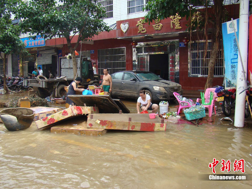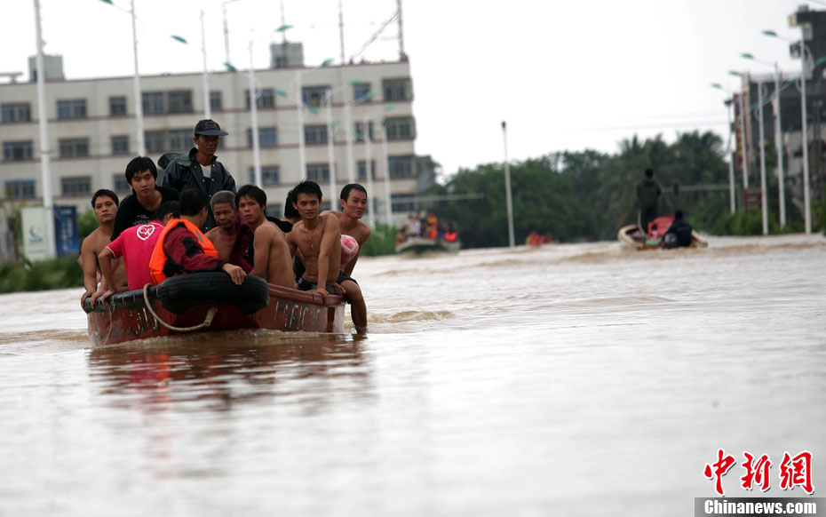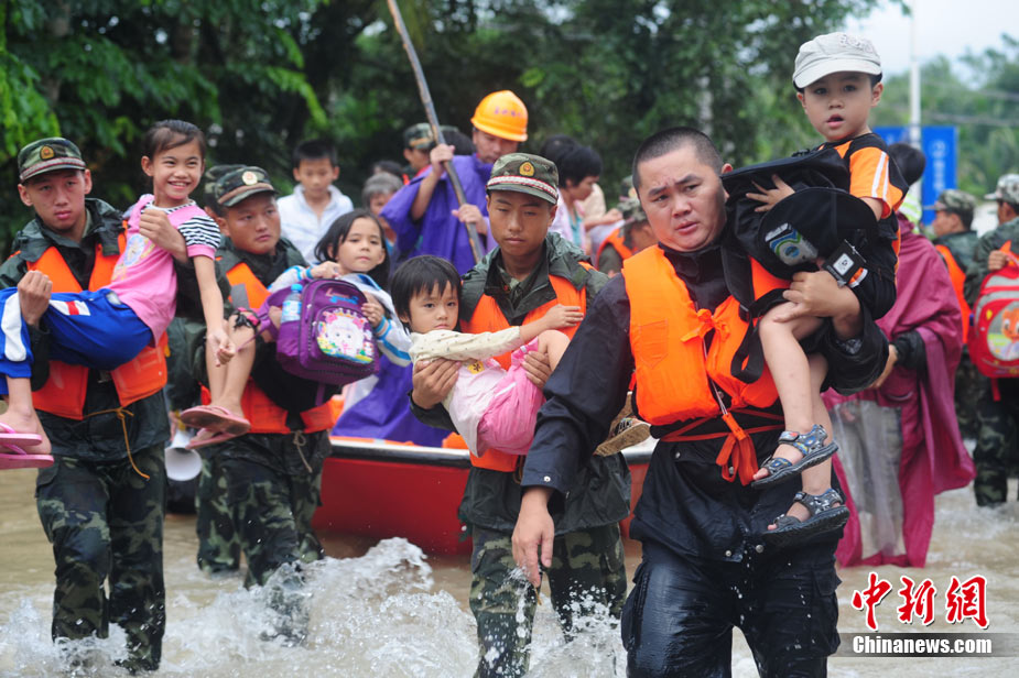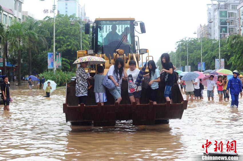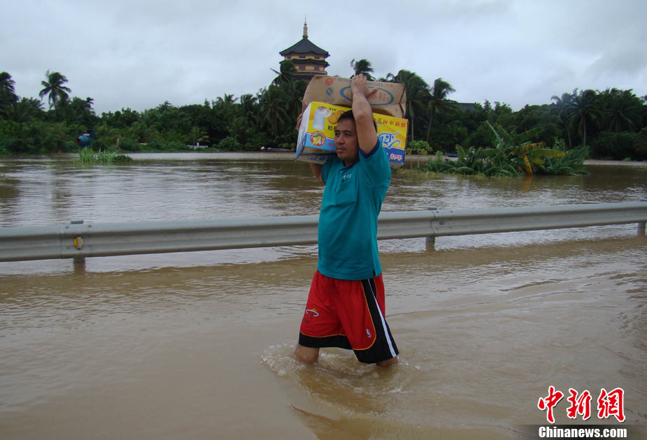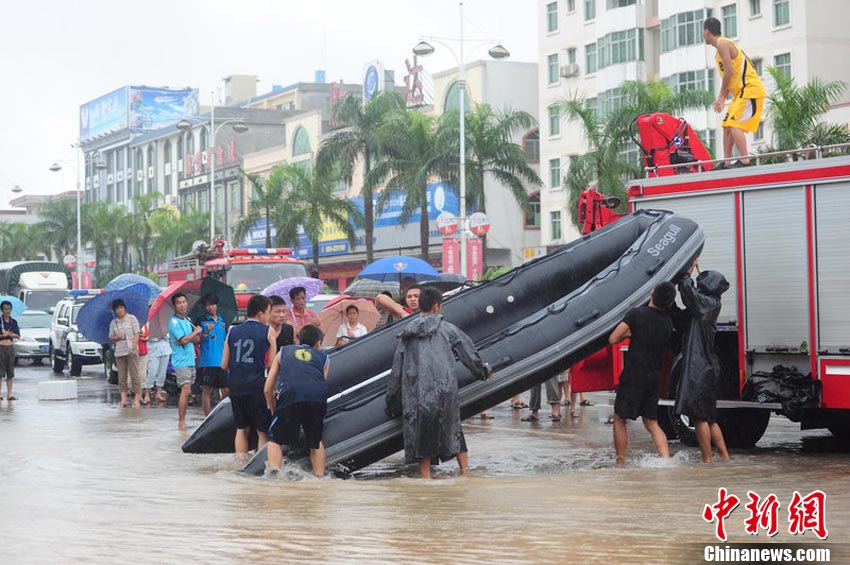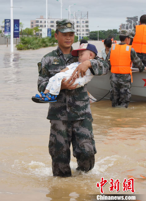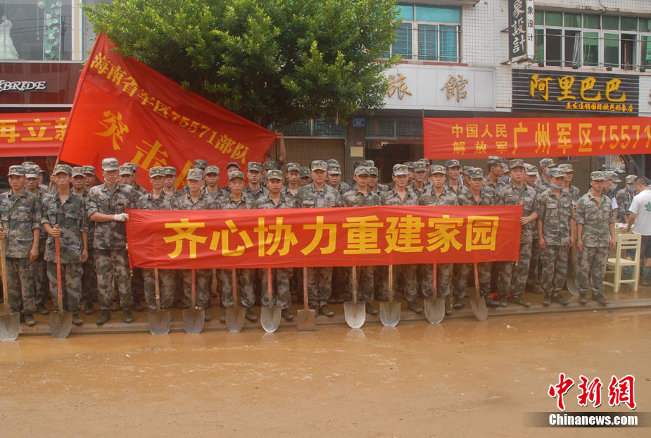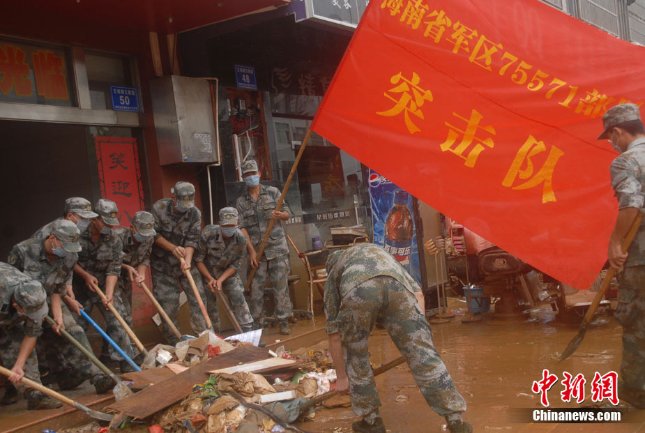 10月10日上午,持續(xù)多天強(qiáng)降雨的海南文昌市天空放晴,圍困文昌市區(qū)的洪水已消退,沿街商戶正在整理物品,清潔店面衛(wèi)生,供水供電在中午時(shí)分得以恢復(fù)。圖為海南省軍區(qū)某海防團(tuán)上百名官兵參與清潔城市參與衛(wèi)生。 中新社發(fā) 張成 攝