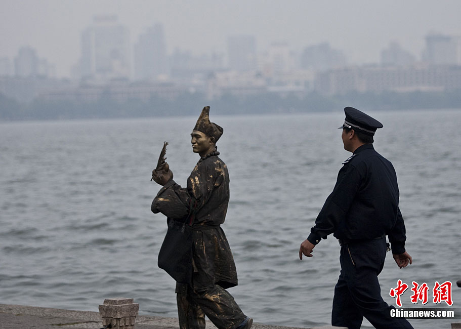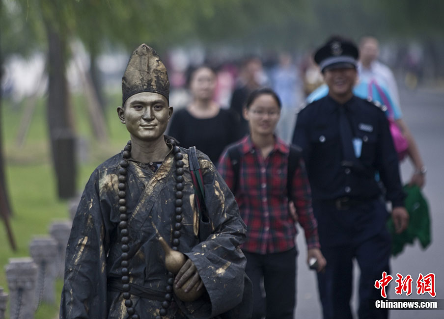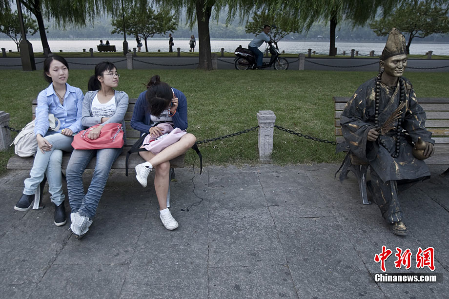 2010年10月上旬,一名打扮成濟(jì)公模樣的人在浙江省杭州市西湖白堤和游客合影,“濟(jì)公”身上涂滿了銅顏色的彩繪,看上去像雕塑一樣。據(jù)悉,這位20多歲“濟(jì)公”來(lái)自江蘇,從今年春天開(kāi)始扮成“濟(jì)公”,在全國(guó)游走。和他合影需要交5元錢。許康平 攝 圖片來(lái)源:cnsphoto