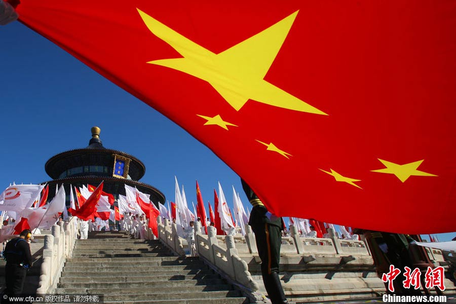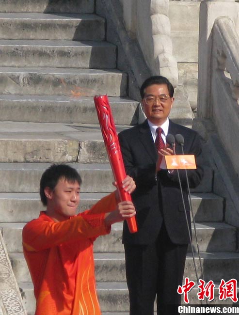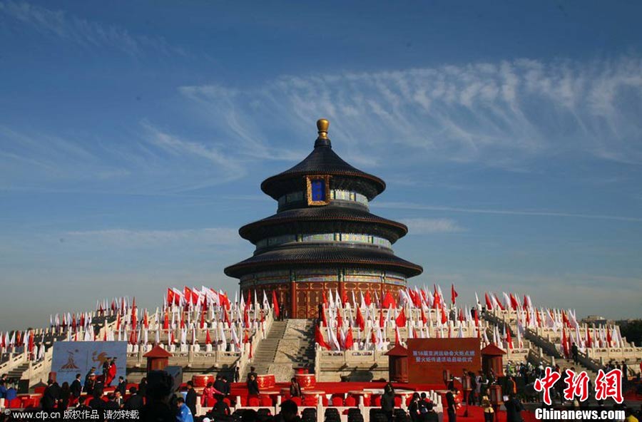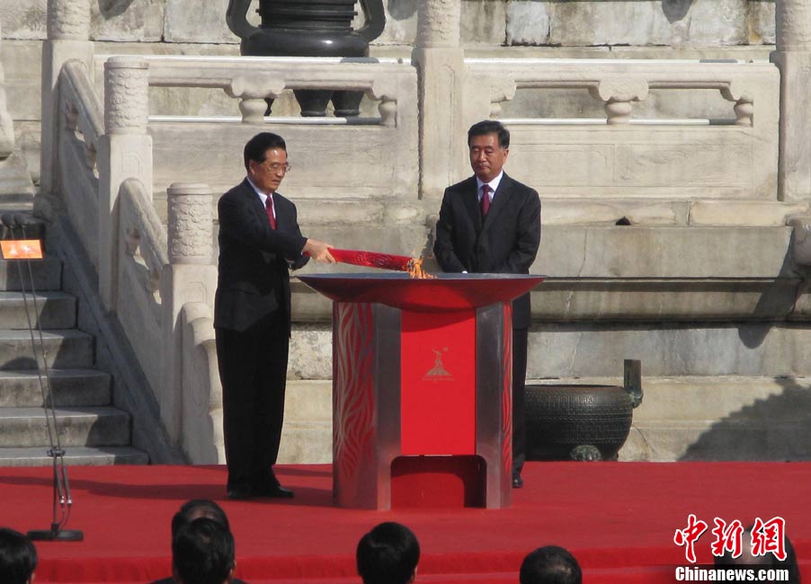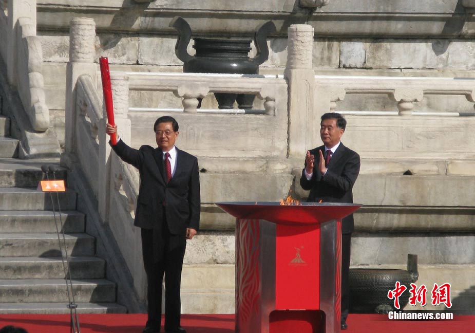 10月12日上午,廣州亞運(yùn)會(huì)火炬點(diǎn)燃暨傳遞啟動(dòng)儀式在北京天壇祈年殿南廣場(chǎng)舉行。10點(diǎn)17分,中共中央總書記、國(guó)家主席胡錦濤點(diǎn)燃主火炬。 中新社記者 沈晨 攝