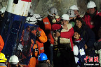 智利首名升井礦工弗洛倫西奧•阿瓦洛斯(Florencio Avalos)北京時(shí)間13日上午11點(diǎn)10分左右搭乘特制救生艙回到地面,成功獲救。目前,救援工作成功邁出第一步,救生艙接下來將繼續(xù)放入井下,營救其余32名被困礦工。圖為阿瓦洛斯出井后與智利總統(tǒng)皮涅拉擁抱。