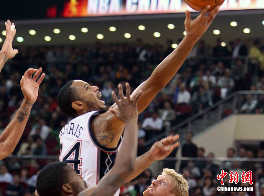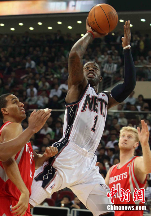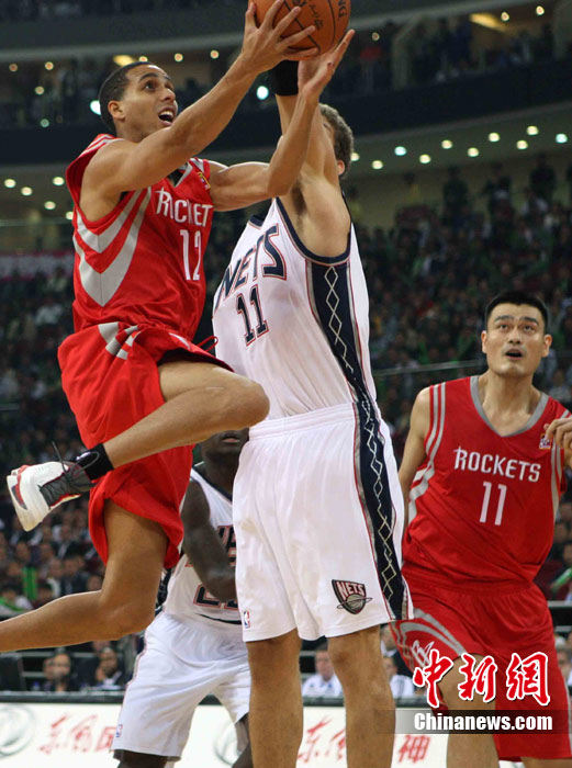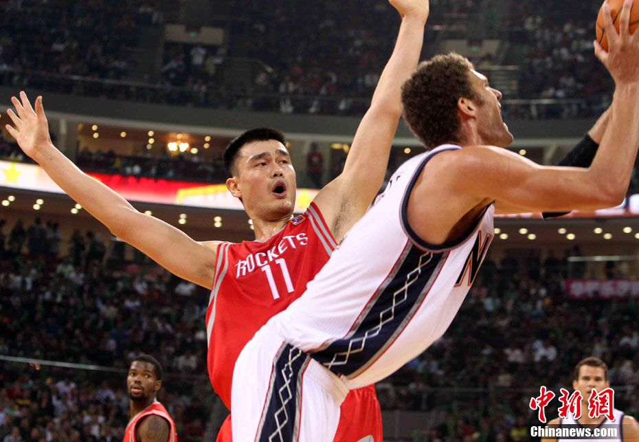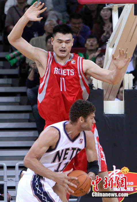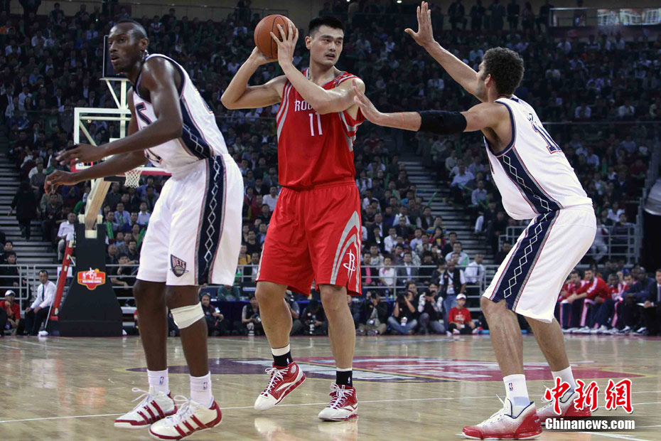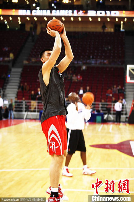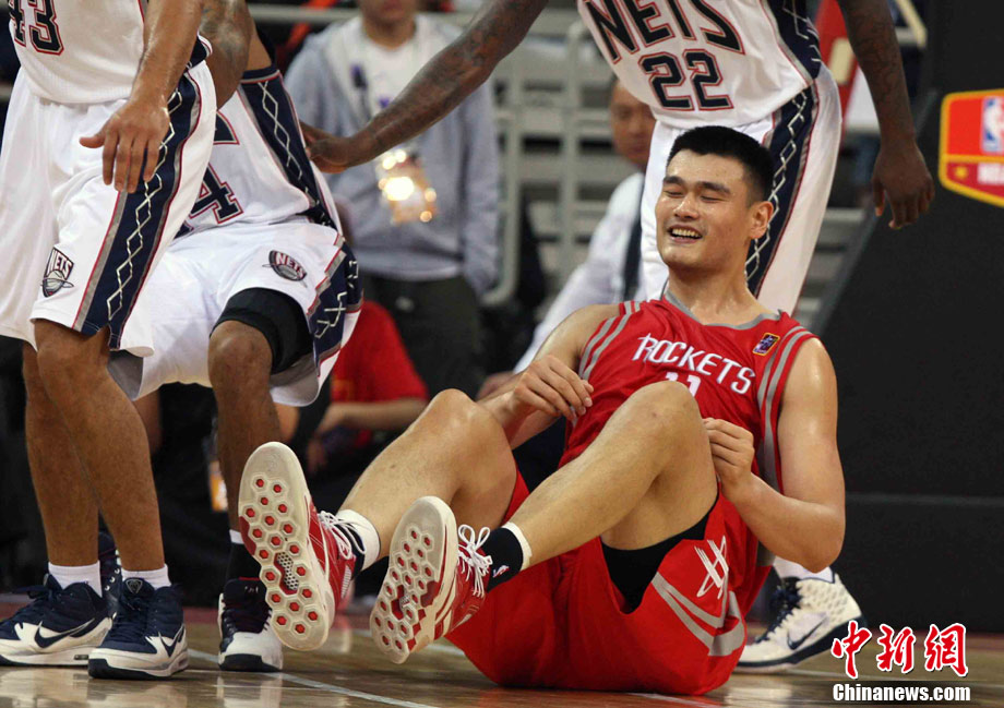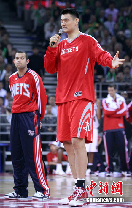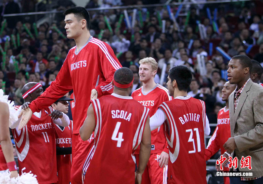 10月13日,NBA中國賽第一場(chǎng)比賽在北京五棵松體育館舉行,休斯敦火箭隊(duì)迎戰(zhàn)新澤西網(wǎng)隊(duì)。兩支球隊(duì)將于本月16日在廣州進(jìn)行第二場(chǎng)比賽。圖為姚明熱身后在場(chǎng)邊休息。圖片來源:CFP視覺中國