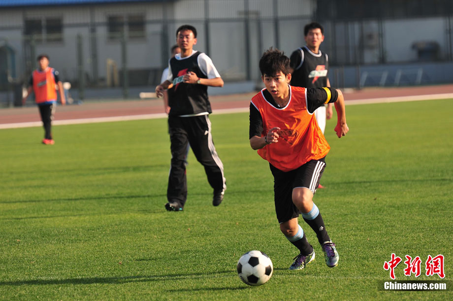 10月13日,“青春綻放”大學(xué)生音樂之旅大賽走進(jìn)北京大學(xué)舉行宣傳活動(dòng)。蘇醒、王嘯坤、王錚亮等潮流歌手組成明星足球隊(duì),與北大學(xué)子們?cè)诰G茵場(chǎng)上切磋球技,揮灑青春熱情。據(jù)悉,“青春綻放”大學(xué)生音樂之旅大型音樂人才選拔活動(dòng)已進(jìn)入高校宣傳階段,將陸續(xù)走進(jìn)清華大學(xué),首都師范大學(xué),中央民族大學(xué)等十多所高校,鼓勵(lì)更多的大學(xué)生參賽,展現(xiàn)青春自我。圖為蘇醒帶球突破。中新社記者 李學(xué)仕 攝