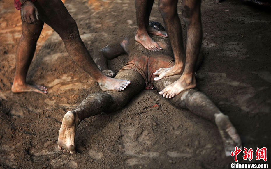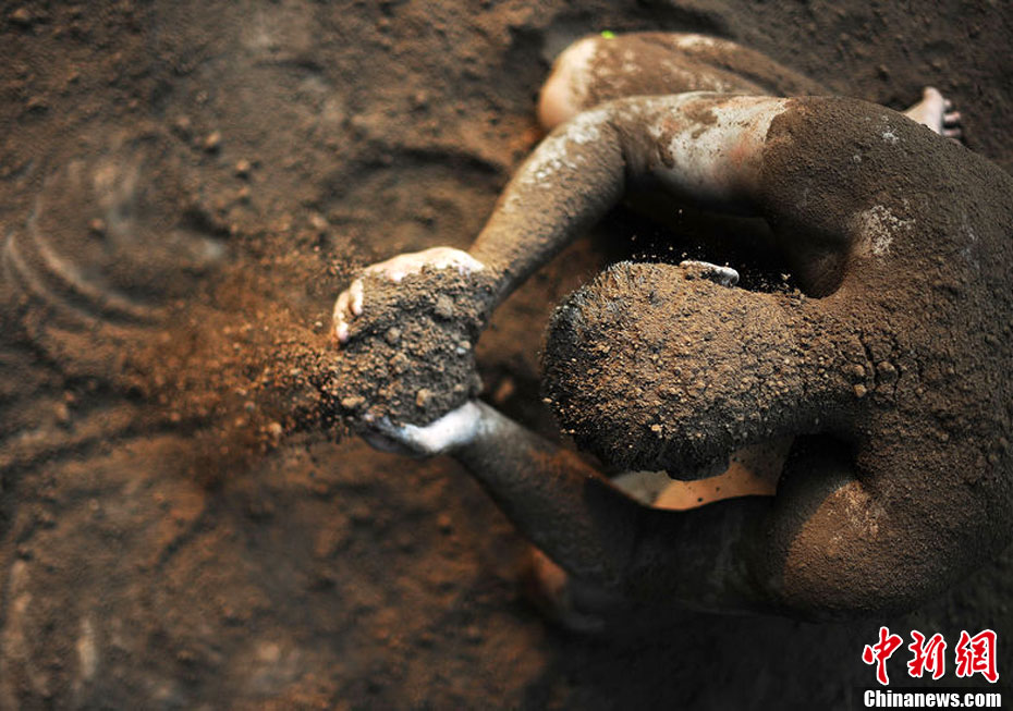 圖為巴基斯坦泥地摔跤手的訓(xùn)練生活。