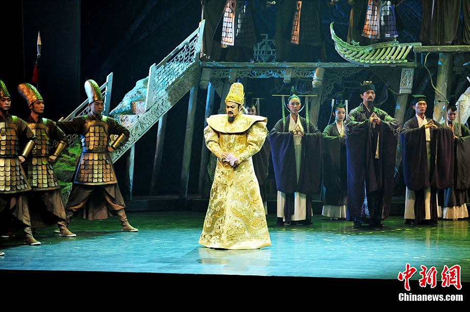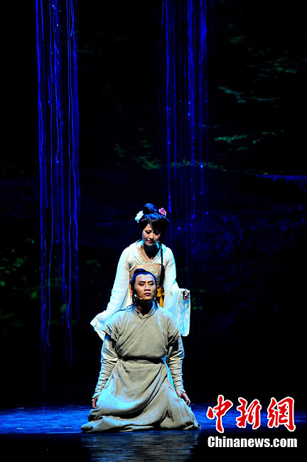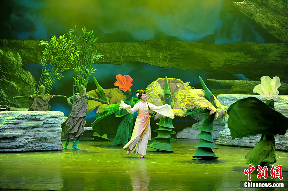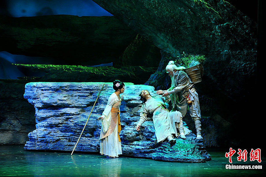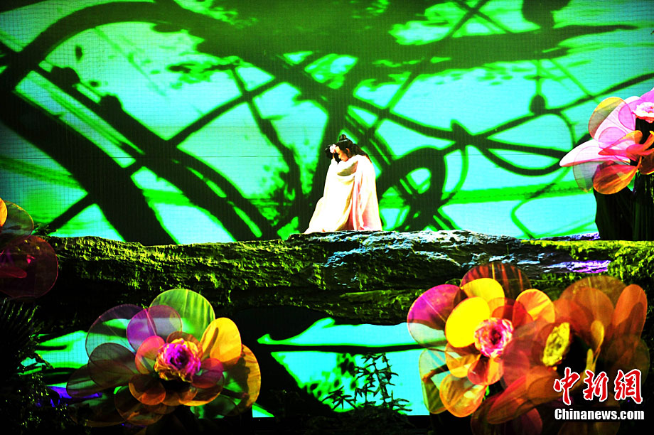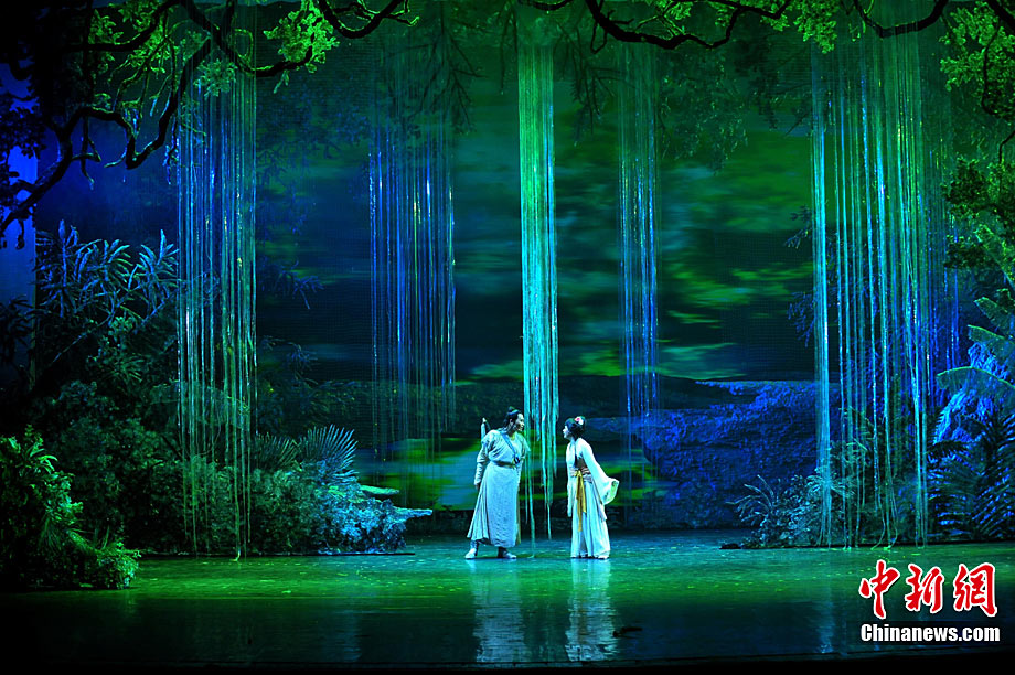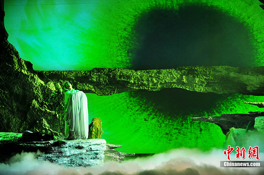 10月16日晚,匯集了中國內地頂級音樂劇創(chuàng)作團隊集體智慧的大型原創(chuàng)多媒體音樂劇《青城》在成都錦城藝術宮舉行全球首演。該劇以青城山傳統(tǒng)道教文化為精神內核,以成都市唯一的世界自然文化雙遺產地“青城山—都江堰”作為劇情發(fā)展“舞臺”,是全球“首部道文化多媒體音樂劇”,也是象征成都市都江堰災后文化重建、人性重建、精神重建的文化作品。圖為《青城》劇照。中新社發(fā) 安源 攝