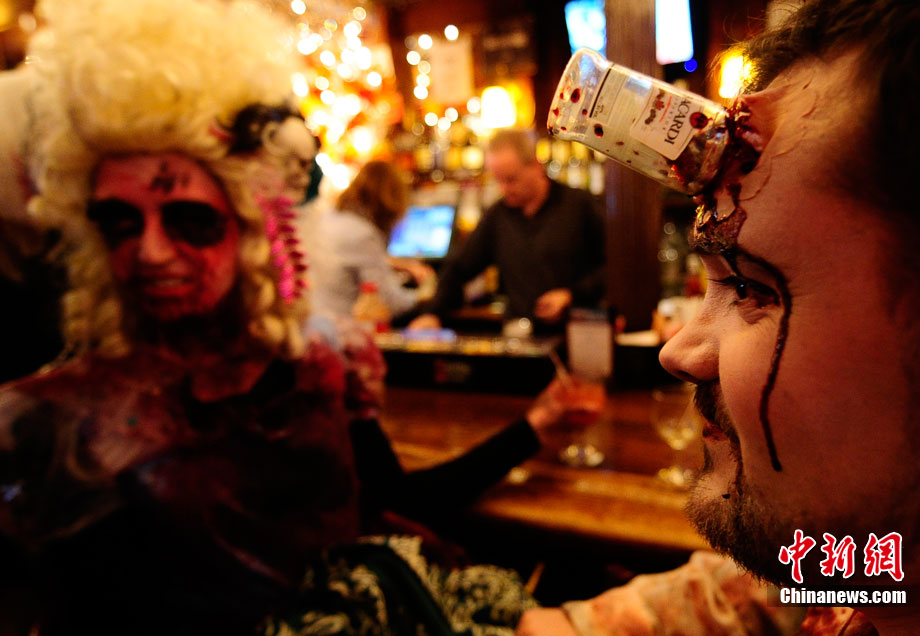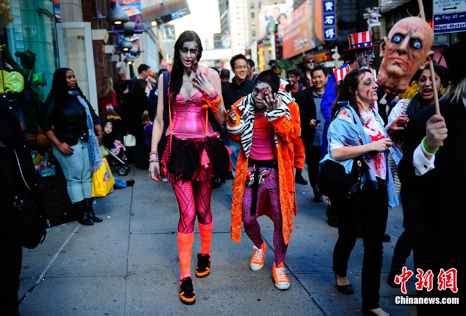 當(dāng)?shù)貢r(shí)間10月16日,美國紐約曼哈頓舉行了盛大的僵尸大游行。數(shù)百名狂歡者將自己打扮成僵尸模樣嚇唬路上的民眾。