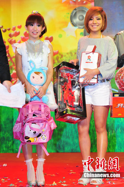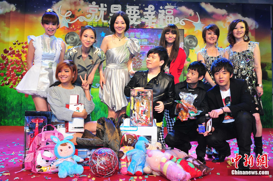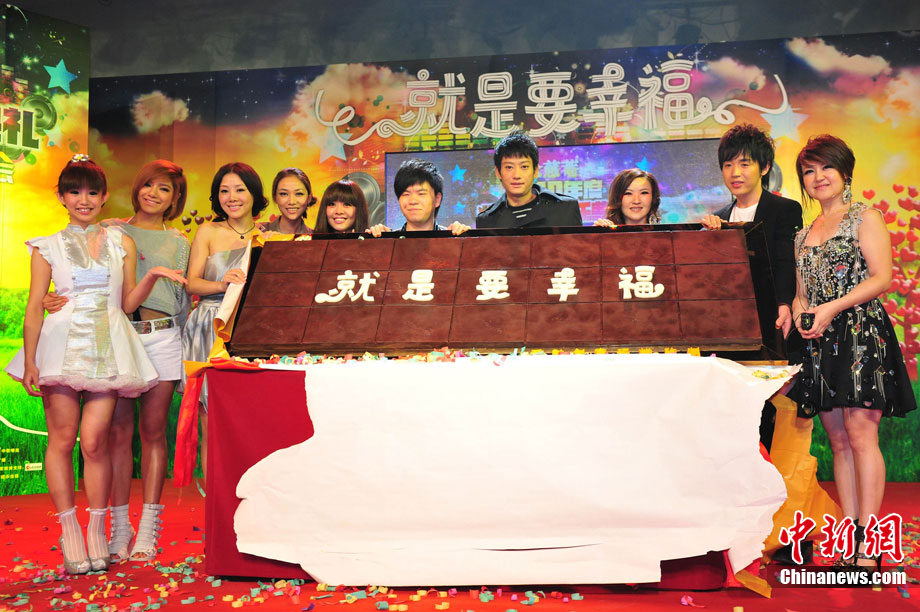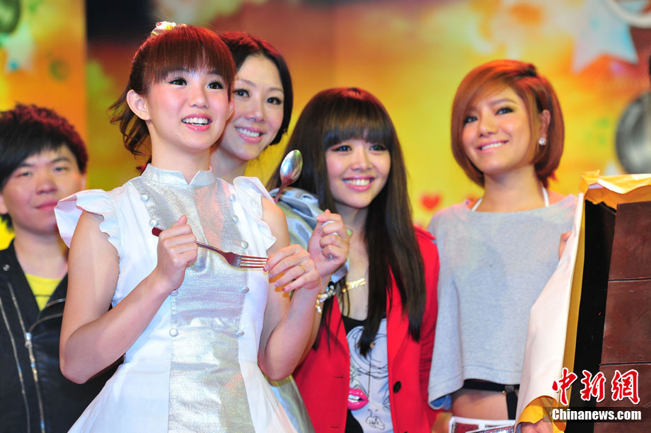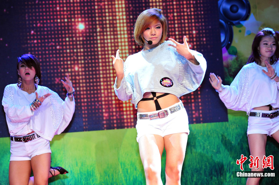 10月17日,2010年度北京流行音樂典禮歡唱會啟動儀式在京舉行,宣告“中歌榜”年度盤點正式啟動。江映蓉、臺灣“奶油甜心”郭書瑤、王箏、黃琦雯、常石磊等樂壇的新生力量到場助陣,共同品嘗一塊重達8公斤的巨型巧克力,巧克力上的“就是要幸!弊謽右彩潜灸甓鹊涠Y口號。圖為江映蓉在現(xiàn)場勁歌熱舞。中新社記者 李學仕 攝