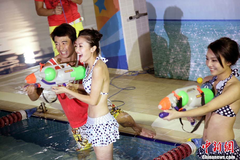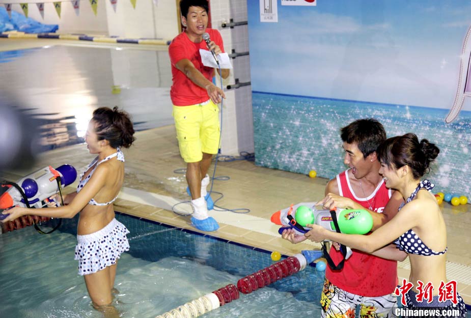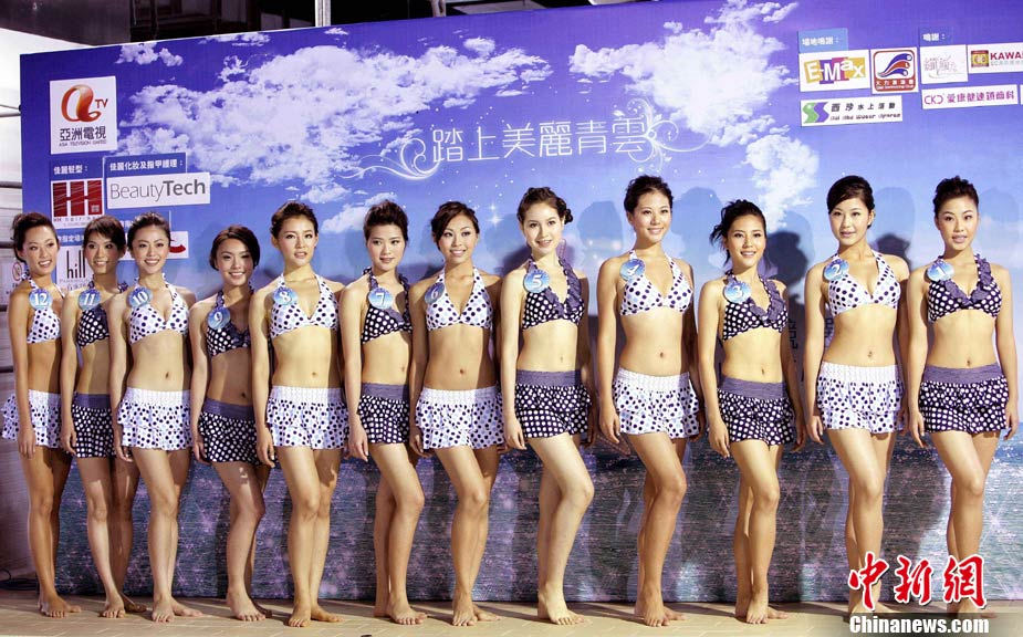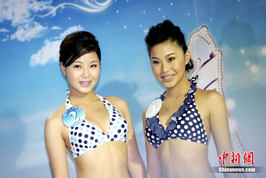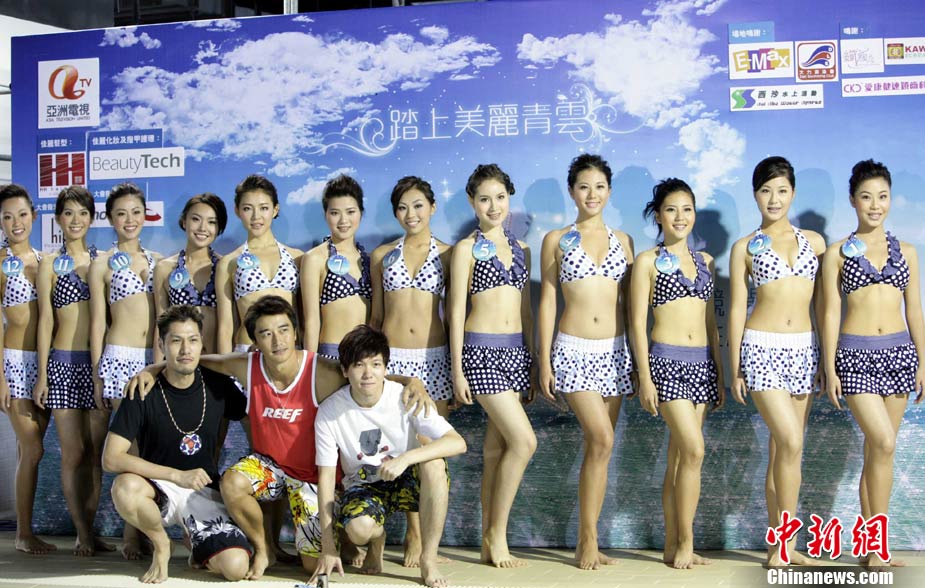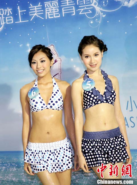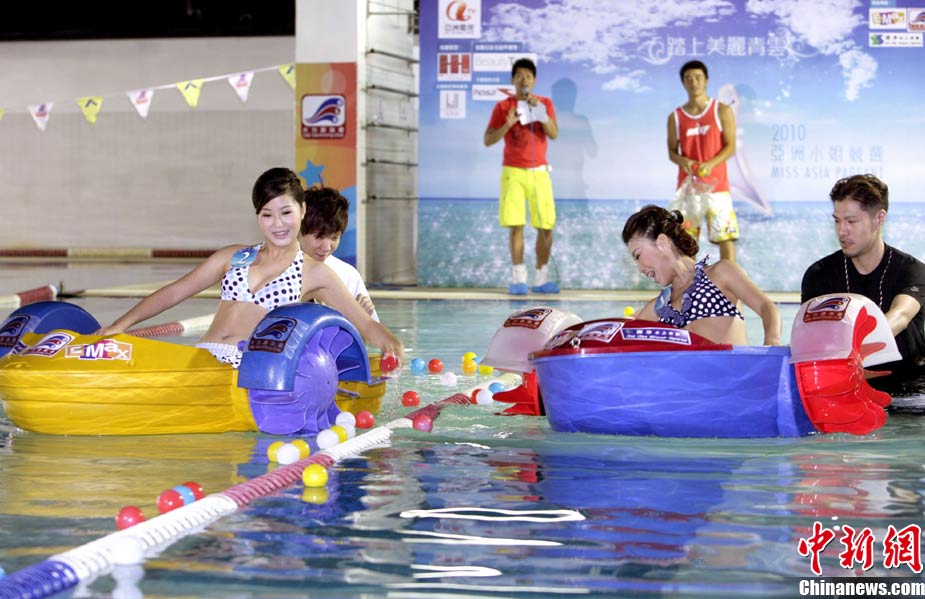 10月19日,參加《2010亞洲小姐競選》(港澳賽區(qū))的9號佳麗陳明月(右)和10號佳麗何婭換上泳裝,進行水上競技,以各種游戲方式放松心情去迎接總決賽。中新社發(fā) 洪少葵 攝