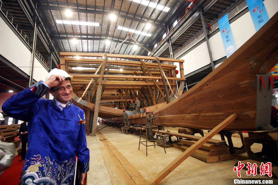 10月20日,南京,作為“2010年南京名城會(huì)”的序曲,“鄭和寶船復(fù)建慶典”在鄭和寶船廠舉行,主體已經(jīng)完工1/3的“鄭和寶船”露出“廬山真面目”。這座鄭和寶船將在明年9月船體竣工,2013年將沿著鄭和當(dāng)年的航海路線“環(huán)球航行”。圖為復(fù)建的寶船進(jìn)行了肋骨安放儀式。邵丹 攝 圖片來(lái)源:CFP視覺(jué)中國(guó)