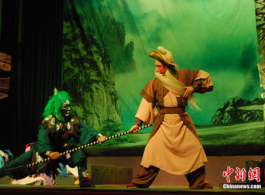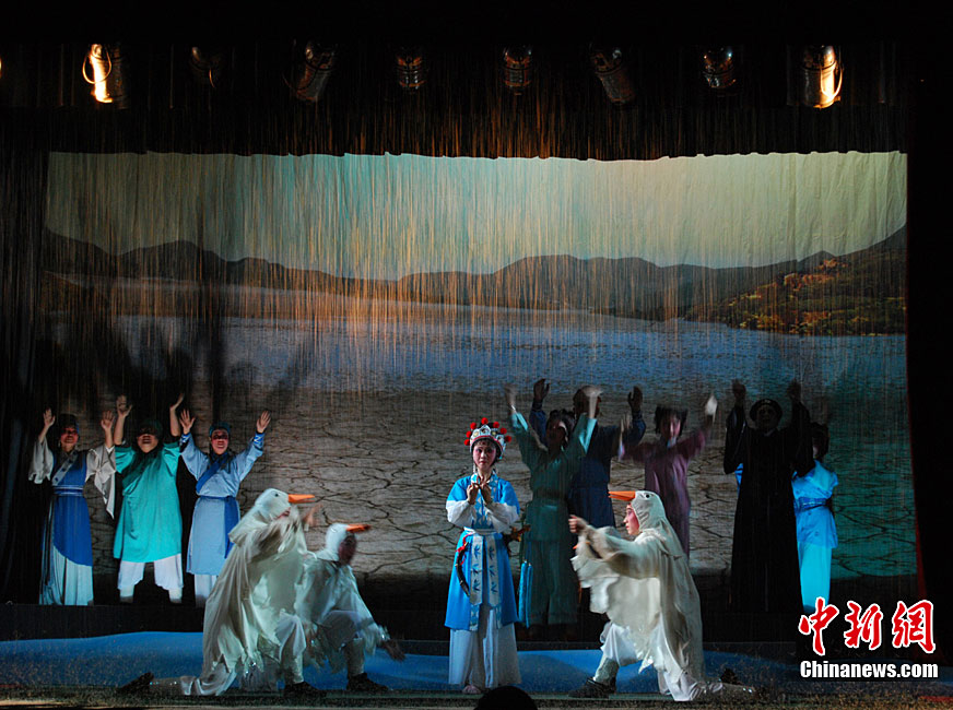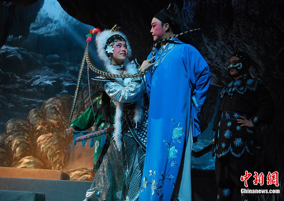 10月22日晚,中國(guó)首屆臨水夫人陳靖姑文化學(xué)術(shù)研討會(huì)獻(xiàn)演劇目,大型神話閩劇《臨水夫人陳靖姑》在陳靖姑祖廟所在地——福建古田精彩上演。該劇由古田縣閩劇團(tuán)演出,共有《陳靖姑出世》、《蛇鬼禍害》、《延婚離家》、《結(jié)義學(xué)法》、《婚禮劍影》、《蛇鬼陰謀》、《哭別嬰兒》、《閩江祈雨》、《得道臨水》、《天上人間》10個(gè)場(chǎng)次,講述了陳靖姑降妖除魔、救助婦孺的感人事跡。兩岸媽祖宮廟代表人和當(dāng)?shù)匦疟,共同觀看了此次演出。李松 攝