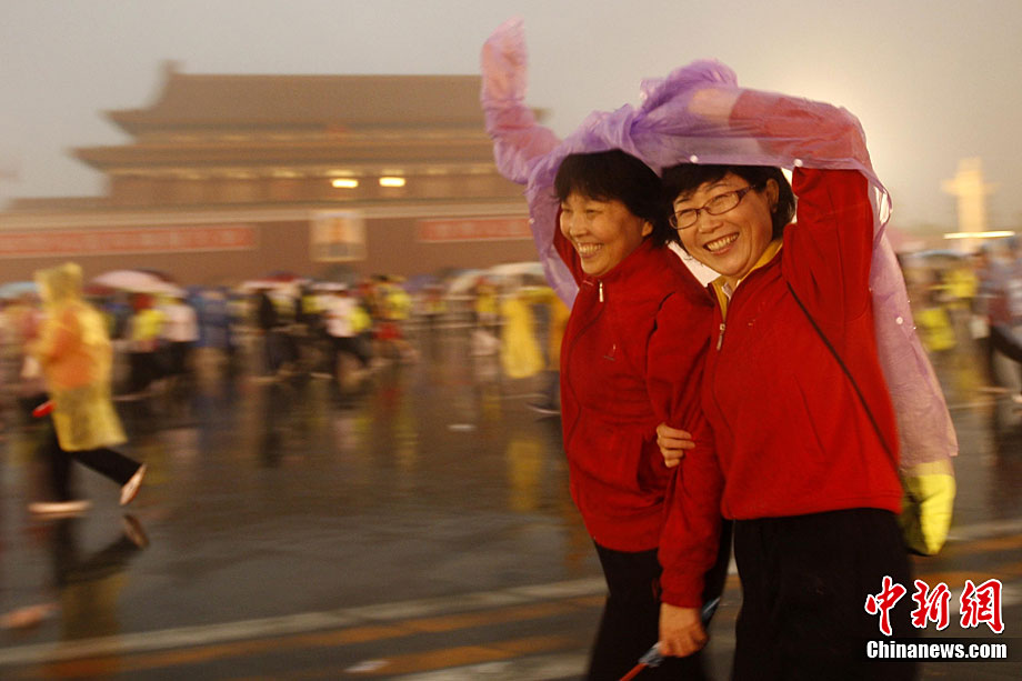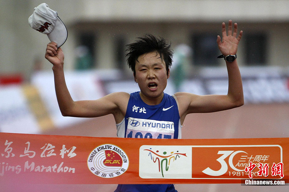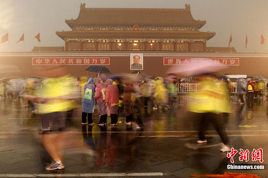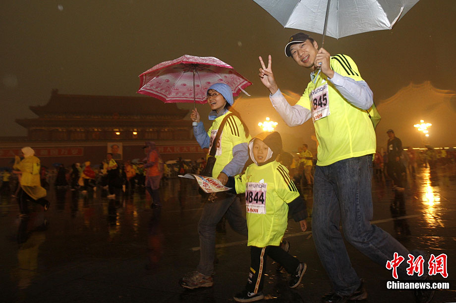 10月24日8時,2010年北京馬拉松正式鳴槍,所有參賽運動員在淅淅瀝瀝的小雨中從天安門廣場出發(fā)。今年的北京馬拉松正式與國際接軌,與往年不同的特點是北京馬拉松賽、全國馬拉松錦標(biāo)賽以及首都高校馬拉松賽“三賽合一”,并采取一次發(fā)槍制,所有組別的選手都同時出發(fā)。中新社記者 富田 攝