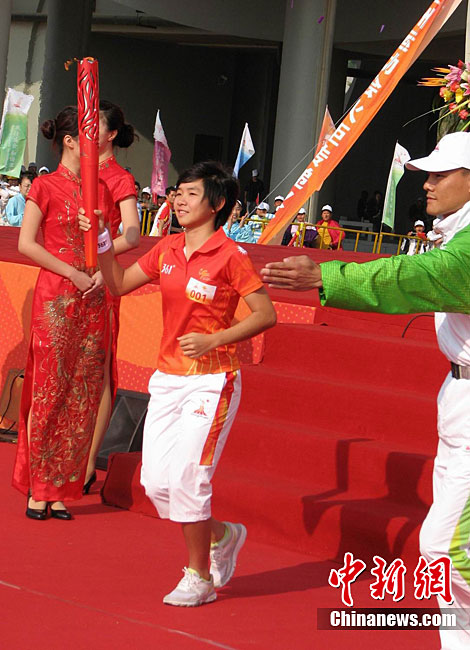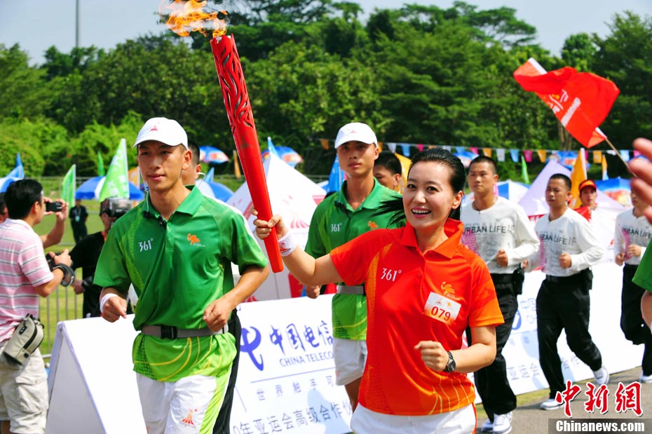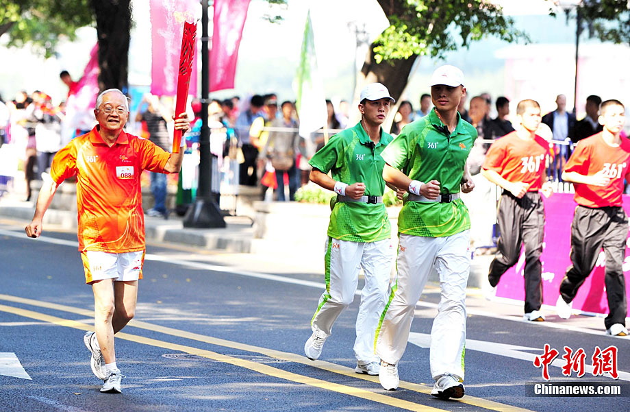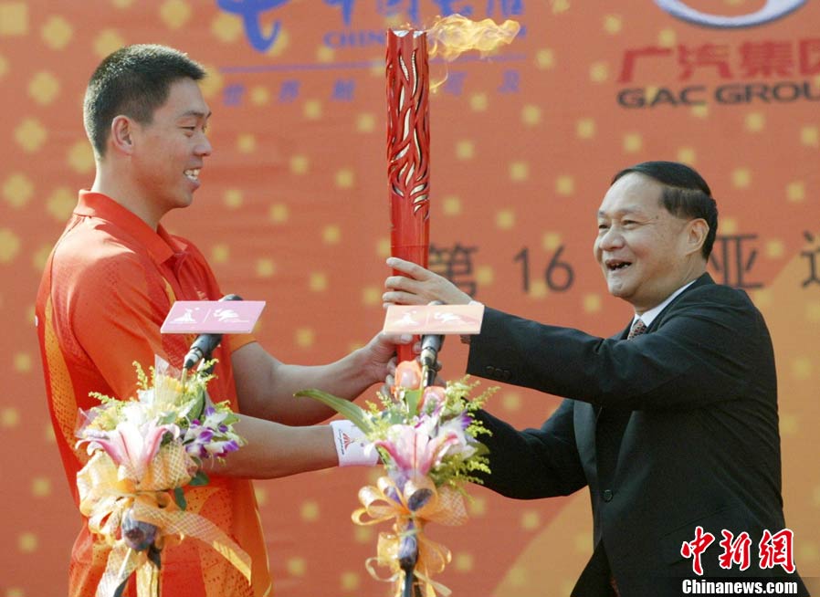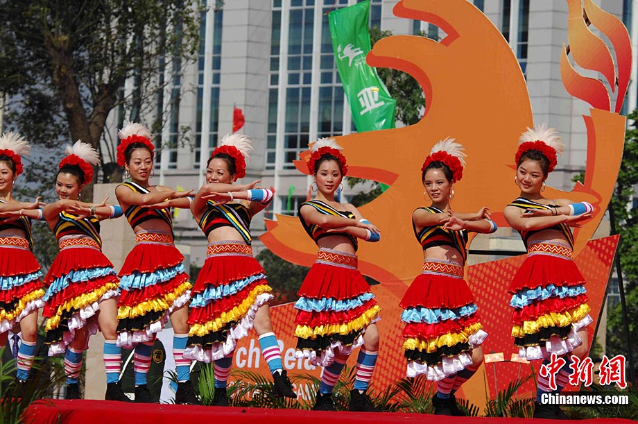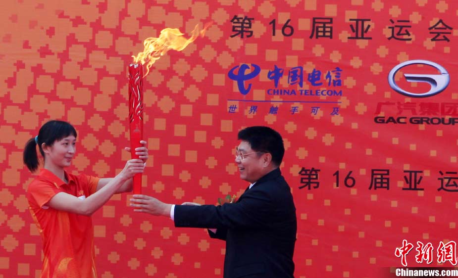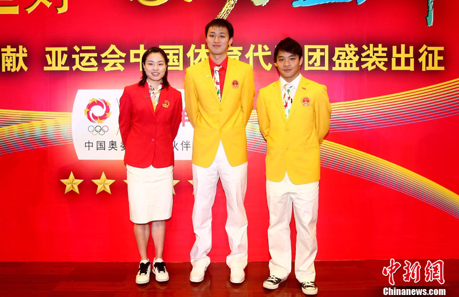 10月25日,第16屆亞運(yùn)會(huì)中國體育代表團(tuán)禮儀服裝在北京國家體育總局新聞廳正式發(fā)布。服裝采用經(jīng)典紅、黃兩色,寓意恒久美好。圖為運(yùn)動(dòng)員張琳、吳敏霞、何沖展示代表團(tuán)禮儀服裝。 中新社記者 杜洋 攝