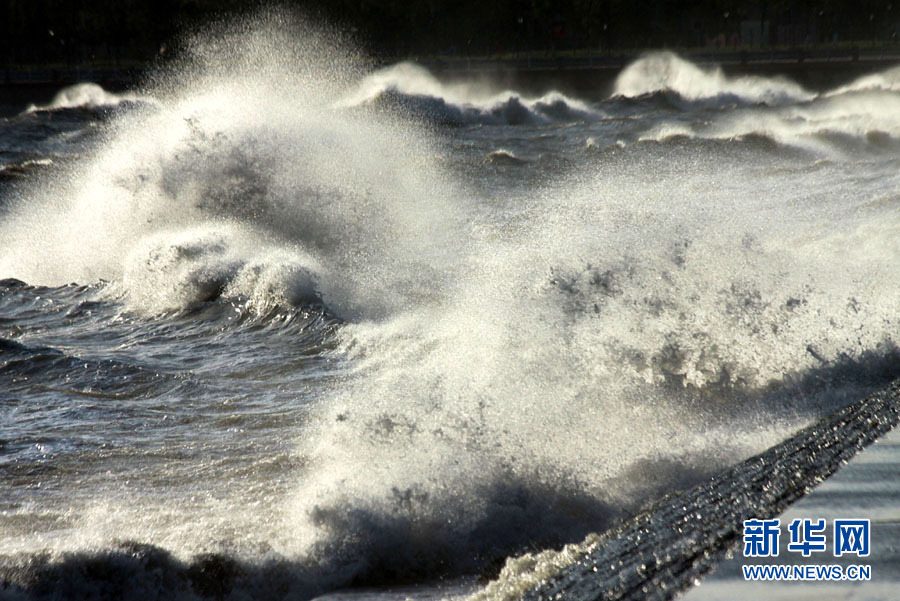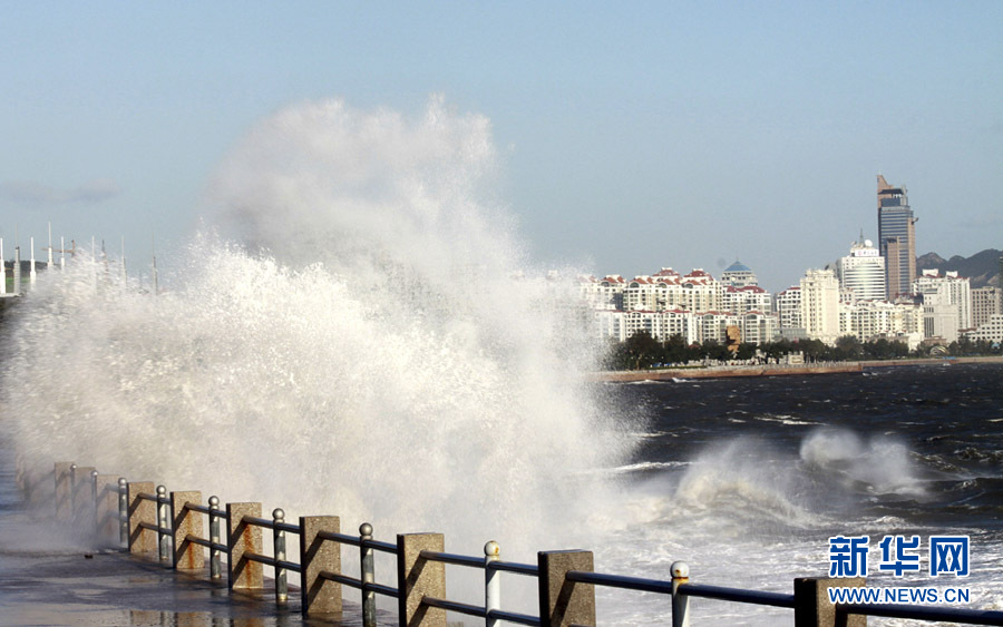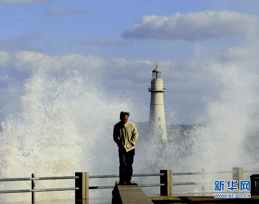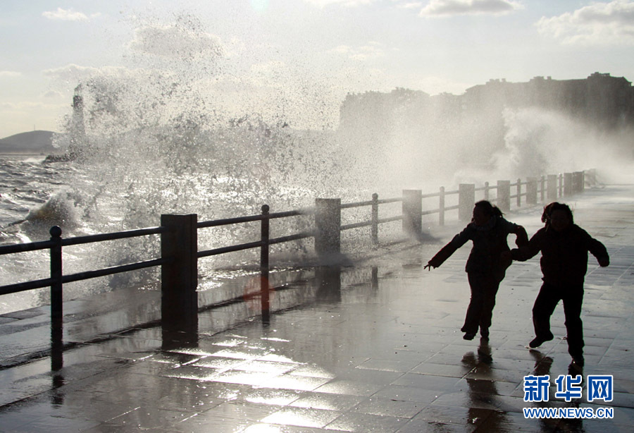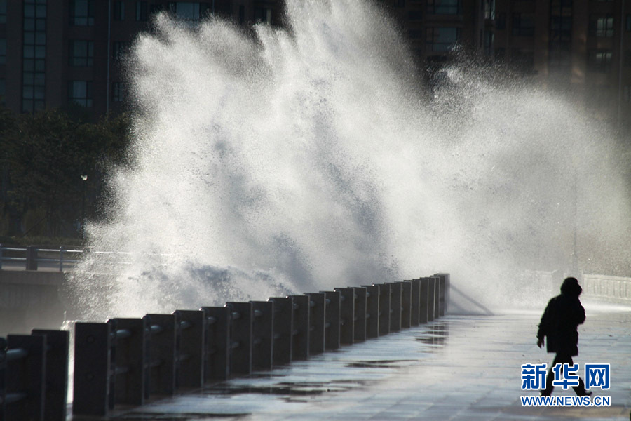10月25日,一名行人從山東威海海濱掀起的浪花旁走過。當(dāng)日,受強(qiáng)冷空氣影響,山東威海海上風(fēng)力達(dá)8至9級,陣風(fēng)風(fēng)力達(dá)到11級,海濱大浪排空,威海市海上搜救中心發(fā)布海上風(fēng)險黃色預(yù)警。于啟波 攝 圖片來源:新華網(wǎng)