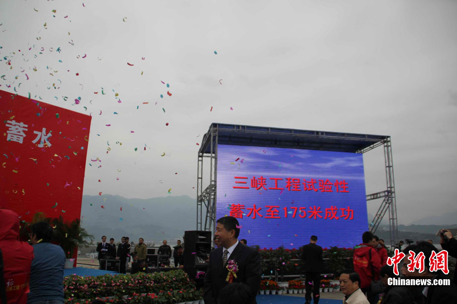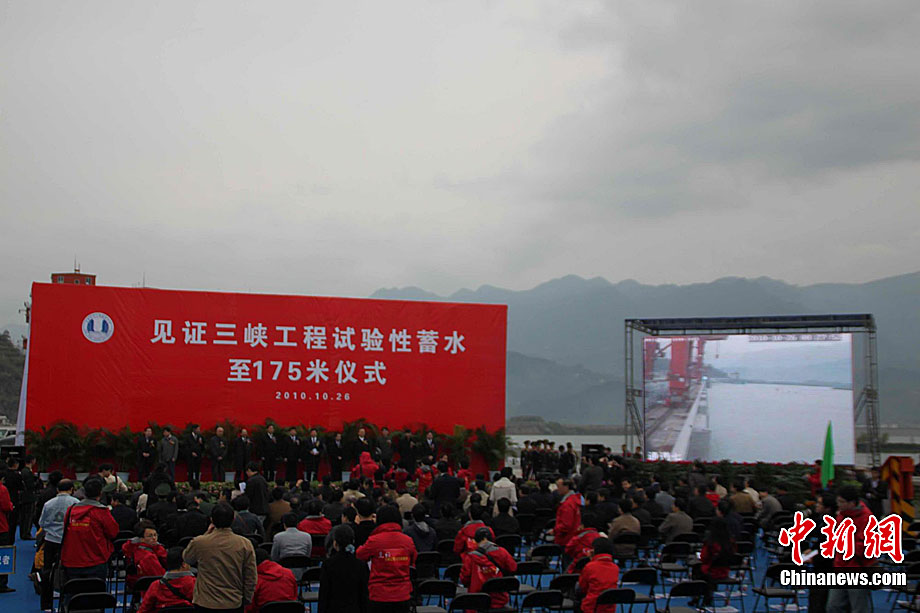 10月26日上午8時(shí)30分,在三峽大壩壩頂舉行了“見證三峽工程試驗(yàn)性蓄水至175米儀式”,8時(shí)55分,中國長江三峽集團(tuán)公司董事長曹廣晶宣布,三峽工程首次達(dá)到175米正常蓄水位,這標(biāo)志三峽工程由初期運(yùn)行期轉(zhuǎn)入正常運(yùn)行期。劉良偉 攝