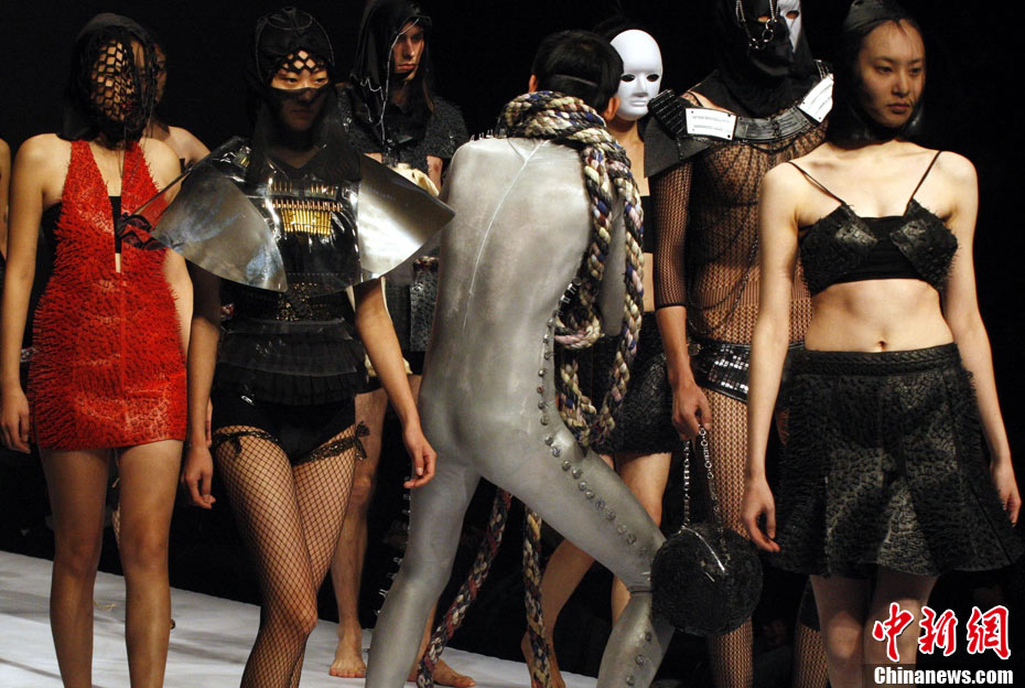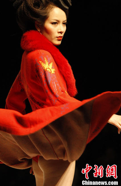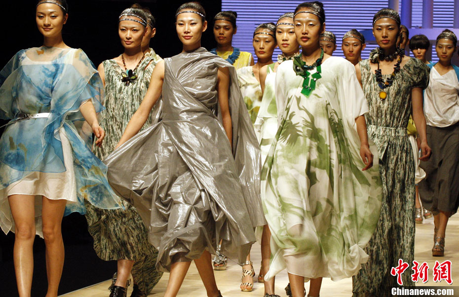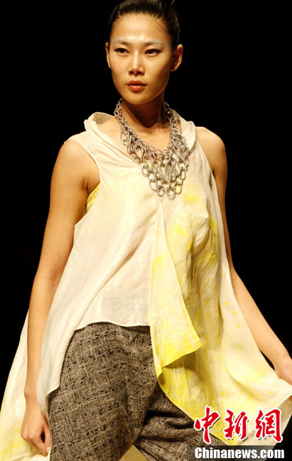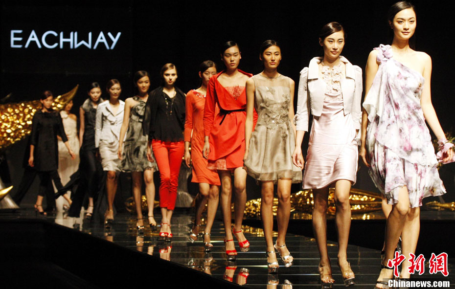 10月26日晚,正在北京舉行的中國國際時裝周上演EACHWAY·趙卉洲2011春夏時裝發(fā)布會,該作品風格簡約自然、清新優(yōu)雅、大氣內(nèi)斂,贏得眾多職場女性的青睞。2011春夏系列包含三大主題:“深海精靈”(藍綠色系)、“夢游幻境”(粉紫色系)、“雙色游戲”(米咖色系),圍繞摩登柔美和經(jīng)典的花卉印花兩大元素展開。中新社記者 錢興強 攝