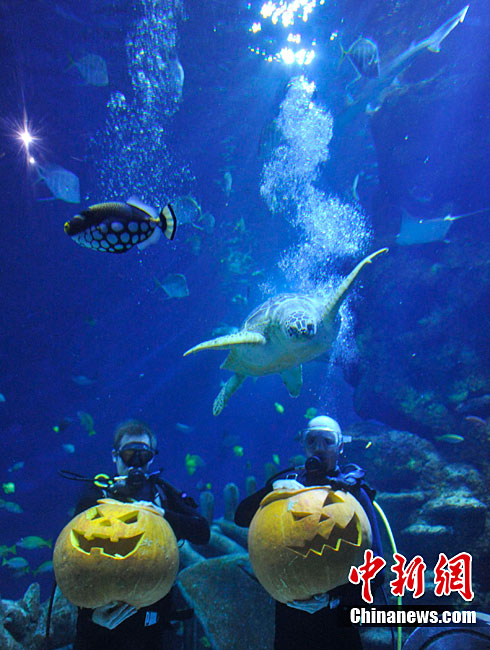 潛水員水下雕南瓜宣傳倫敦水族館萬圣節(jié)活動(dòng)