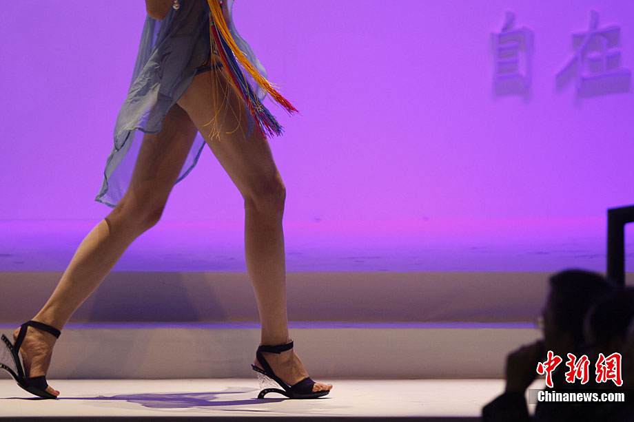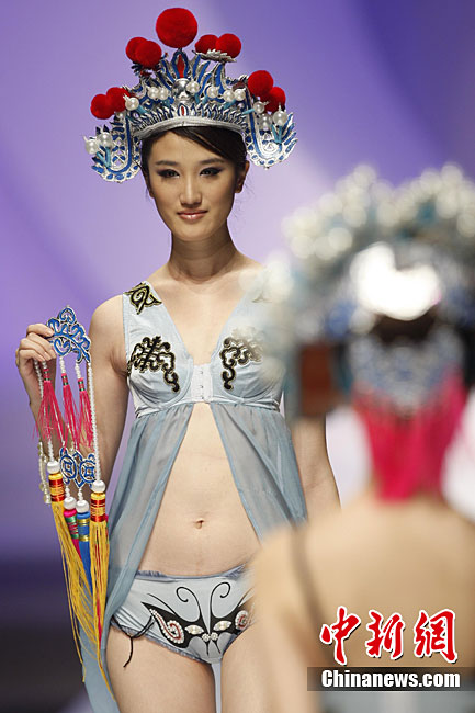10月28日, 2010“歐迪芬杯”中國內(nèi)衣設(shè)計大賽在北京舉行,20位沖過初賽、復(fù)賽層層挑戰(zhàn)的選手們,聚集在中國內(nèi)衣設(shè)計的最高賽場,用創(chuàng)意與靈感展開激烈角逐。圖為模特展示歐迪芬“中國紅”內(nèi)衣系列。中新社記者 盛佳鵬 攝