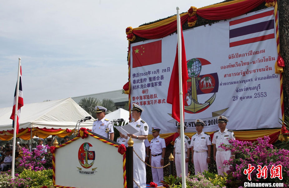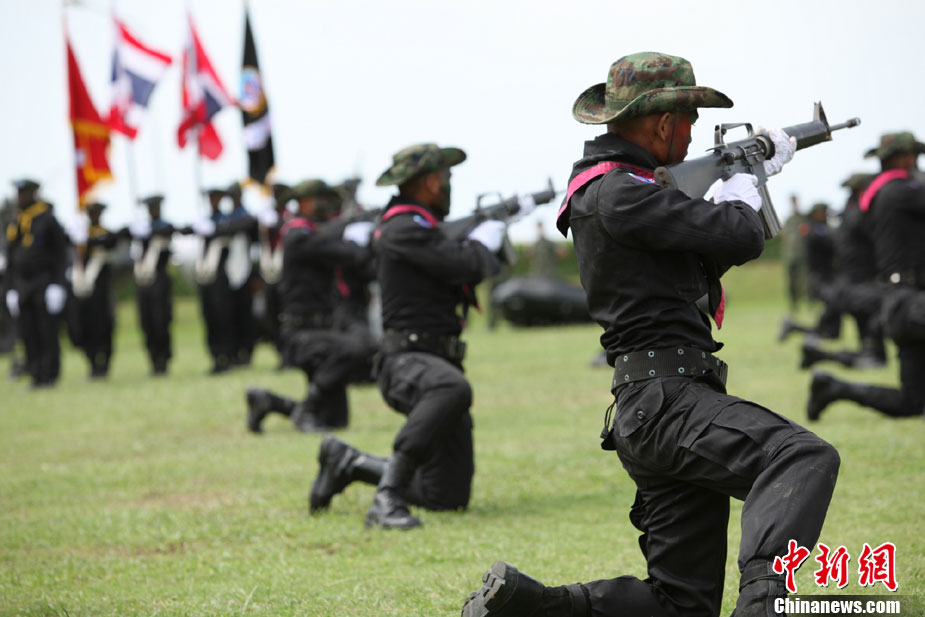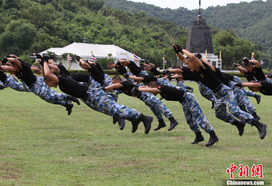 10月28日,代號為“藍色突擊—2010”的中、泰海軍陸戰(zhàn)隊聯(lián)合訓練在泰國梭桃邑海軍基地拉開帷幕。圖為中國海軍陸戰(zhàn)隊參訓官兵在開訓儀式進行技能演示。中新社記者 余顯倫 攝