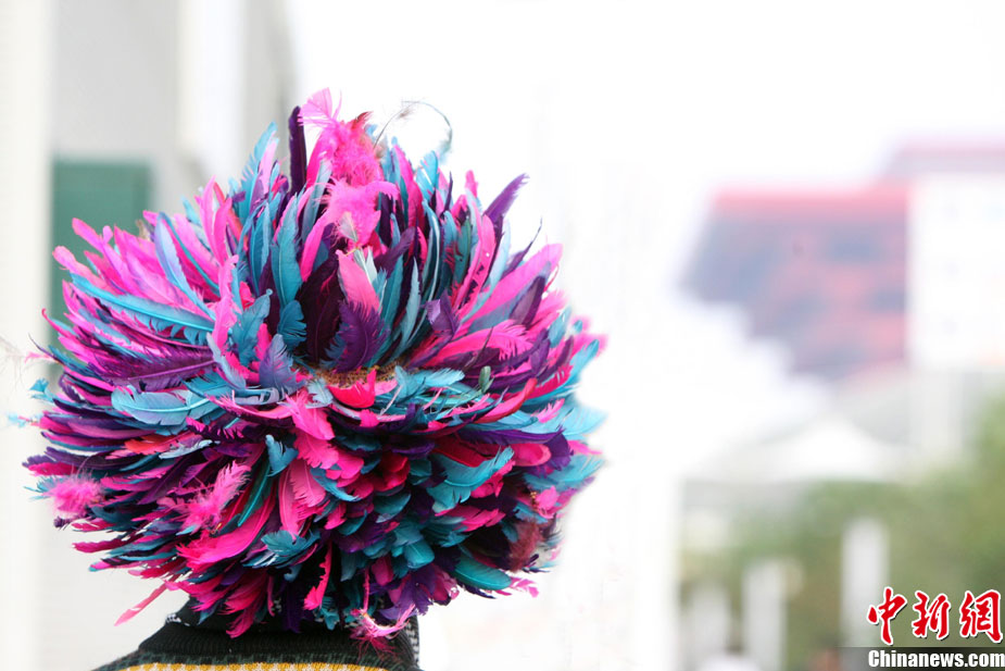 10月28日,一位頭戴“雞毛”的游客在世博園內(nèi)吸引了不少游人的“眼球”。 中新社記者 湯彥俊 攝